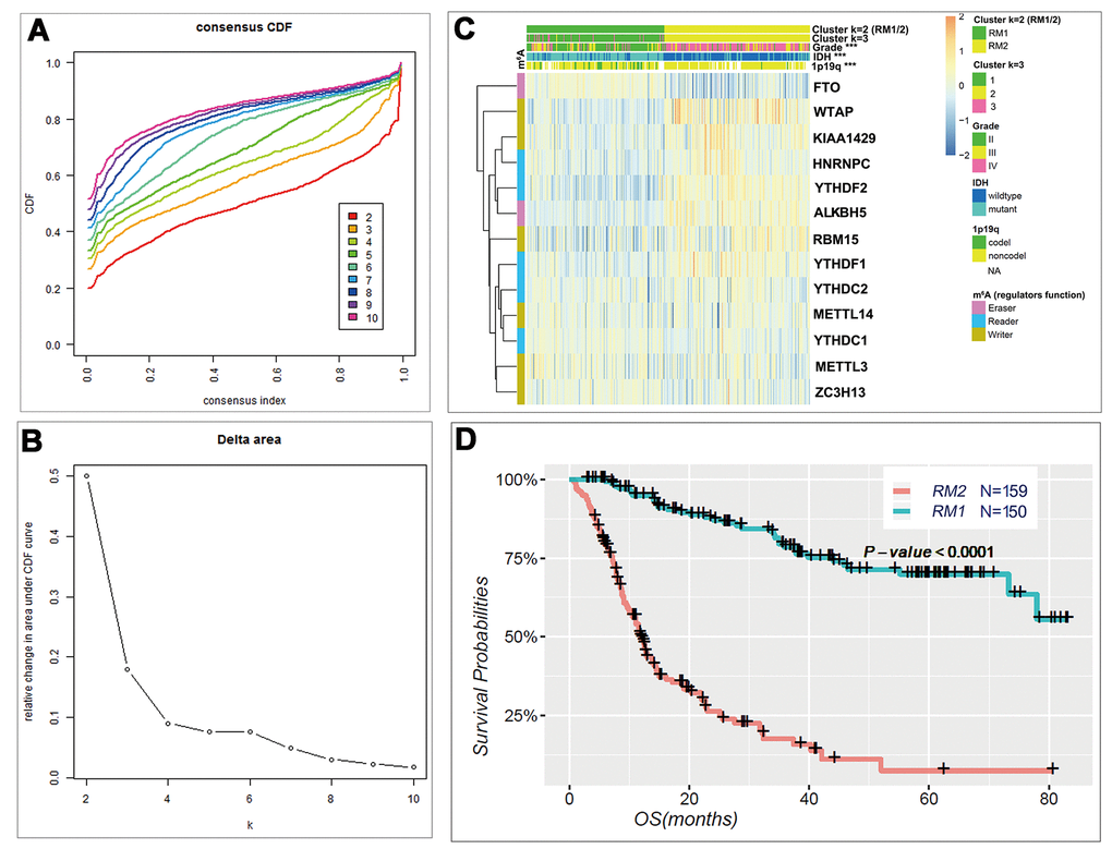 Based on the expression similarity of m6A RNA methylation regulators, k = 3 seemed to be an adequate selection with clustering stability increasing from k = 2 to 10 in the CGGA datasets (Fig. 2A and B). However, we noticed that 293 out of 309 gliomas clustered into one of the two subgroups in the CGGA dataset (Fig. 2C and Figure S3). Thus, we compared the clinicopathological features of these two subgroups clustered by k=2, namely, RM1 and RM2 (Fig. 2C) datasets. The RM1 subgroup is significantly correlated with younger age at diagnosis (P < 0.0001), lower grade (P < 0.0001), proneural or neural subtypes (P < 0.0001), IDH-mutational status (P < 0.0001) and 1p/19q codel status (P < 0.0001). The RM2 subgroup mainly contains gliomas with an older age at diagnosis, glioblastoma (GBM) phenotype, classic or mesenchymal subtypes, IDH-wildtype status and 1p/19q noncodel status (Table S2). Moreover, we observed a significantly shorter overall survival (OS) in the RM2 subgroup than the RM1 subgroup (Fig. 2D).