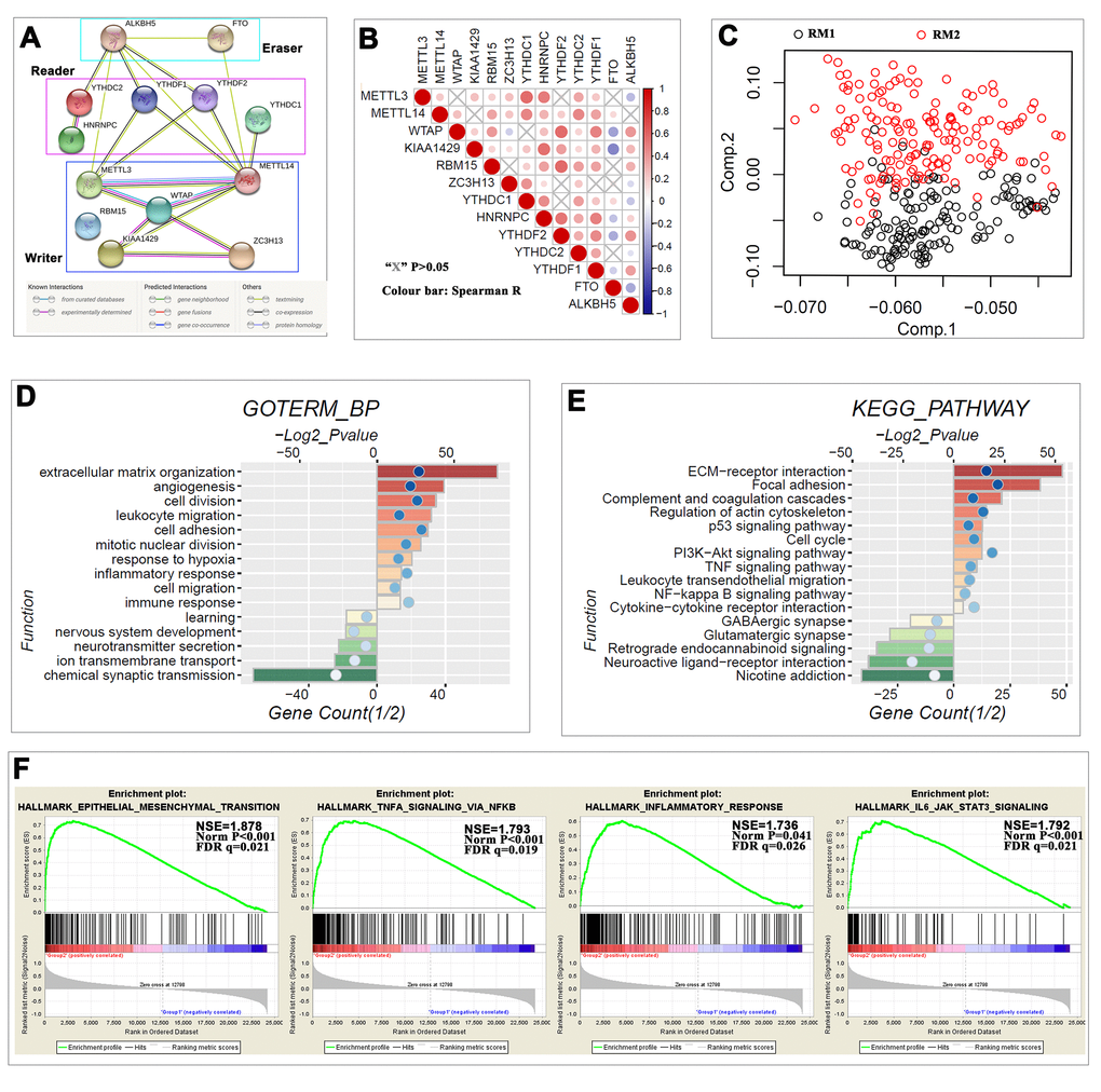 To investigate the function of m6A RNA methylation regulators in gliomas, we clustered the gliomas into different groups with “ConsensusClusterPlus” (50 iterations, resample rate of 80%, and Pearson correlation, http://www.bioconductor.org/). We used PCA with the R package for R v3.4.1 to study the gene expression patterns in different glioma groups. GO and KEGG pathway enrichment analyses were performed with the Database for Annotation, Visualization, and Integrated Discovery (http://david.abcc.ncifcrf.gov/home.jsp) to functionally annotate genes that are differentially expressed in different groups. Interactions among m6A RNA methylation regulators were analyzed using the STRING database (http://www.string-db.org/). GSEA was performed to investigate the functions correlated with different subgroups of gliomas.