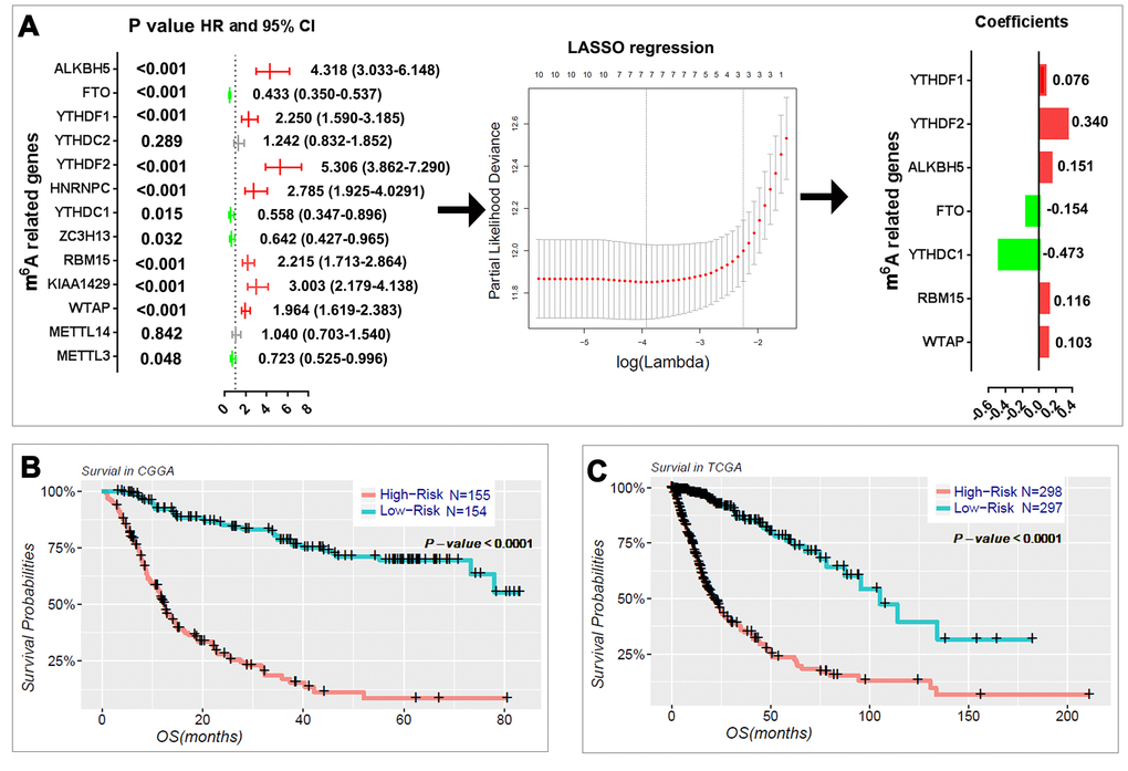 To better predict the clinical outcomes of gliomas with m6A RNA methylation regulators, we applied the least absolute shrinkage and selection operator (LASSO) Cox regression algorithm to the eleven prognosis-associated genes in the CGGA dataset, which we used as a training set (Fig. 4A). Seven genes were selected to build the risk signature based on the minimum criteria, and the coefficients obtained from the LASSO algorithm were used to calculate the risk score for both the training dataset (CGGA) and the validation dataset (TCGA). To investigate the prognostic role of the seven-gene risk signature, we separated the glioma patients in the CGGA (n = 309) and TCGA (n = 595) datasets into low- and high-risk groups based on the median risk score and observed significant differences in OS between the two categories (both P < 0.0001; Fig. 4B, C).
