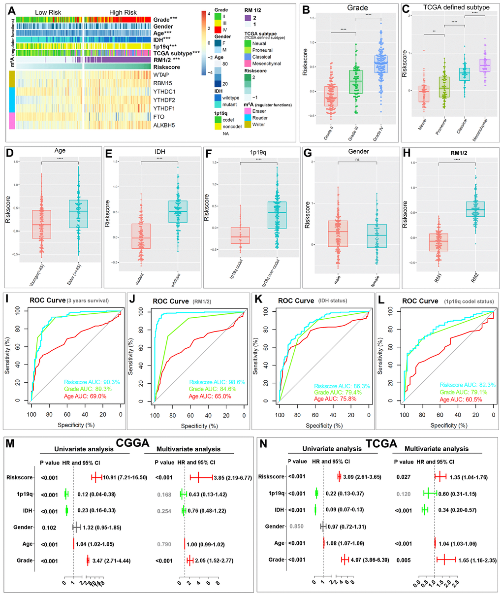 We then performed univariate and multivariate Cox regression analyses for the CGGA dataset to determine whether the risk signature is an independent prognostic indicator. By univariate analysis, the risk score, 1p/19q codel status, IDH status, age and WHO grade were all correlated with the OS. When including these factors into the multivariate Cox regression, the risk score and WHO grade remained significantly associated with the OS (both P < 0.001, Fig. 5M). Similar results were found in the validation of the TCGA dataset; the risk score (P = 0.027), IDH status (P < 0.001), age (P < 0.001) and WHO grade (P = 0.005) remained significantly associated with the OS in the multivariate regression (Fig. 5N). These results confirmed that the risk score derived from m6A RNA methylation regulators can independently predict prognosis in glioma patients.
