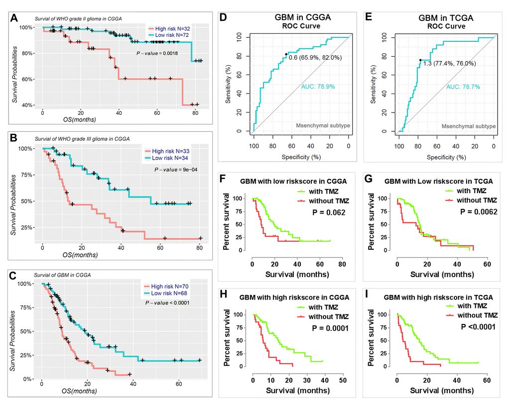We also determined the prognostic value of the risk signature for different WHO grades. We found that patients with high risk scores had significantly shorter OS than those with low scores in WHO grade II and III gliomas (Fig. 6A, B) and GBM (Fig. 6C). Meanwhile, we also observed that the risk score had prognostic value in gliomas stratified by the integrated diagnosis of WHO grade 2016 (Figure S5). Moreover, the risk score could also predict the mesenchymal subtype in GBM for both CGGA (Fig. 6D) and TCGA datasets (Fig. 6E). Consistent with this finding, the patients with a high-risk score were also more sensitive to TMZ treatment in GBM for both CGGA and TCGA datasets (Fig. 6F-I).