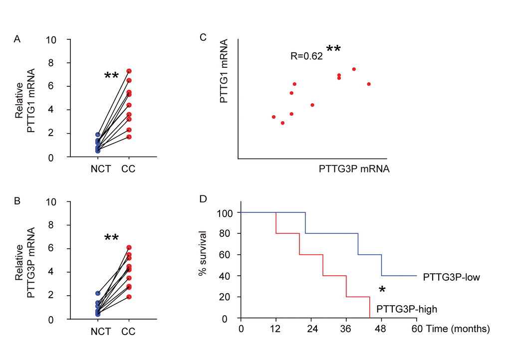 Here, we studied the activation and regulation of PTTG1 in CC, and their association with the expression of the pseudogene of PTTG1, PTTG3P.