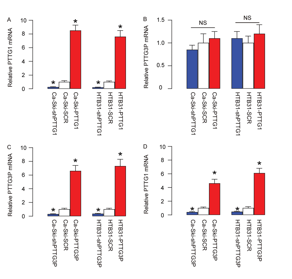 In order to determine the regulatory relationship between PTTG1 and PTTG3P, we overexpressed PTTG1 or depleted PTTG1 (by expressing short hairpin interfering RNA for PTTG1-shPTTG1) in two CC lines, Ca-Ski and HTB31, or overexpressed PTTG3P or depleted PTTG3P (by expressing short hairpin interfering RNA for PTTG3P-shPTTG3P) in these two CC lines. Plasmids carrying a scrambled sequence (SCR) were used as controls. After confirmation of the effects of PTTG1 or shPTTG1 (Figure 2A), we found that modulation of PTTG1 levels did not alter PTTG3P levels in CC cells (Figure 2B). However, after confirmation of the effects of PTTG3P or shPTTG3P (Figure 2C), we found that overexpression of PTTG3P levels significantly increased PTTG1 levels in CC cells, while depletion of PTTG3P levels significantly decreased PTTG1 levels in CC cells (Figure 2D). These data suggest that PTTG3P is upstream of PTTG1 in CC.