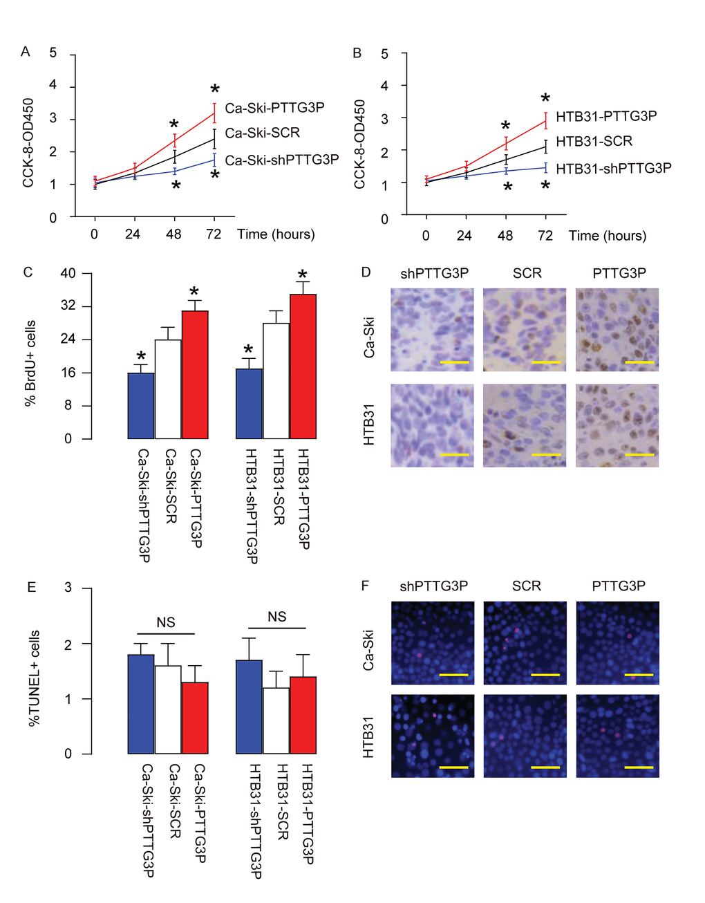 Next, effects of PTTG3P on the growth of CC cells were assessed. In an CCK-8 assay, we found that overexpression of PTTG3P significantly increased growth of Ca-Ski cells (Figure 3A) and growth of HTB31 cells (Figure 3B), while depletion of PTTG3P significantly decreased growth of Ca-Ski cells (Figure 3A) and growth of HTB31 cells (Figure 3B). BrdU assay showed that overexpression of PTTG3P significantly increased BrdU+ Ca-Ski cells and BrdU+ HTB31 cells, while depletion of PTTG3P significantly decreased BrdU+ Ca-Ski cells and BrdU+ HTB31 cells, shown by quantification (Figure 3C), and by representative images (Figure 3D). TUNEL assay showed that either overexpression of PTTG3P or depletion of PTTG3P did not significantly alter the percentage of TUNEL+ cells, shown by quantification (Figure 3E), and by representative images (Figure 3F). Together, these data suggest that PTTG3P may promote CC growth through increase in cell proliferation.