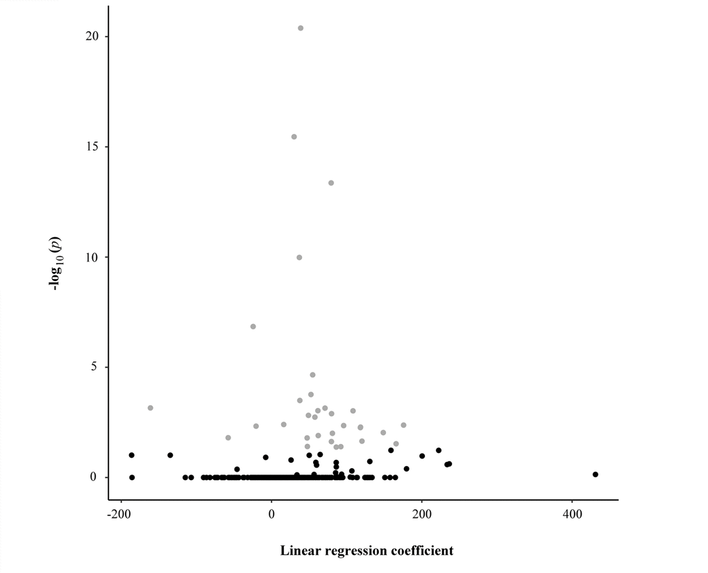 We analysed DNA methylation profiles using Sequenom MassARRAY EpiTYPER, a bisulphite-based technology that relies on base-specific cleavage and mass spectrometry and measures the level of methylation in amplicons containing one or more CpGs. To assess potential epigenetic changes during aging, the profiles were investigated in bisulfite-treated DNA samples collected from 381 subjects (48- to 107-year-old) of the discovery dataset. Specifically, we investigated a total of 1437 CpG sites located within CpG islands falling in candidate genes involved in mitochondrial biogenesis, mitophagy, fusion, and fission processes and annotated in the UCSC genome browser. Following stringent quality control criteria, a total of 500 CpG sites entered further analysis. The sequences of the CpG islands containing these sites and their chromosomal localization are shown in Figure S1. The results of the univariate linear regression analysis are presented in Table 1 and in Figure 1 in which we observed that 54 out of the 500 potential predictors are statistically significant after the Holm method to account for multiple testing. Changes of methylation levels with age at the 54 CpG sites are shown in Figure S2.