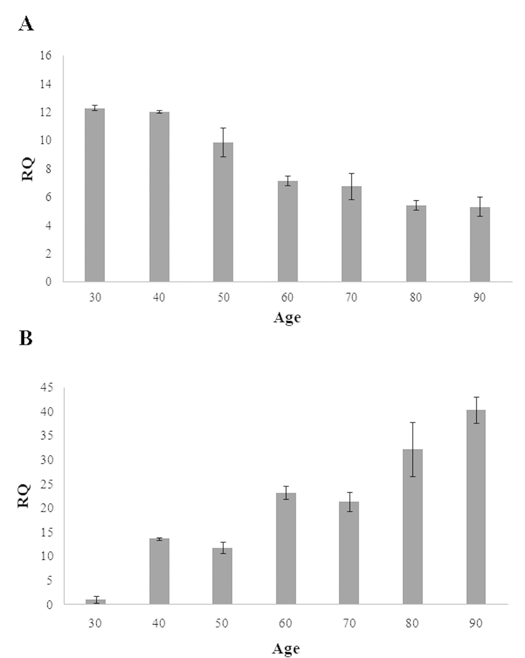 The total RNA was extracted from the blood of individuals of various age (30–90 years old) using ReliaPrep RNA Tissue Miniprep System (Promega Corp, Italy). Briefly, 2.5 ml of fresh whole blood was mixed to 7.5 ml of RNA red blood cell lysis solution and incubated at room temperature for 10 minutes. White cells were isolated by centrifugating samples at 3000 g for 10 minutes and lysed in 200 μl of LBA+TG buffer and 85% μl of isopropanol. The lysate was then transferred to a ReliaPrep minicolumn, and RNA was purified according to manufacturer's recommendation.