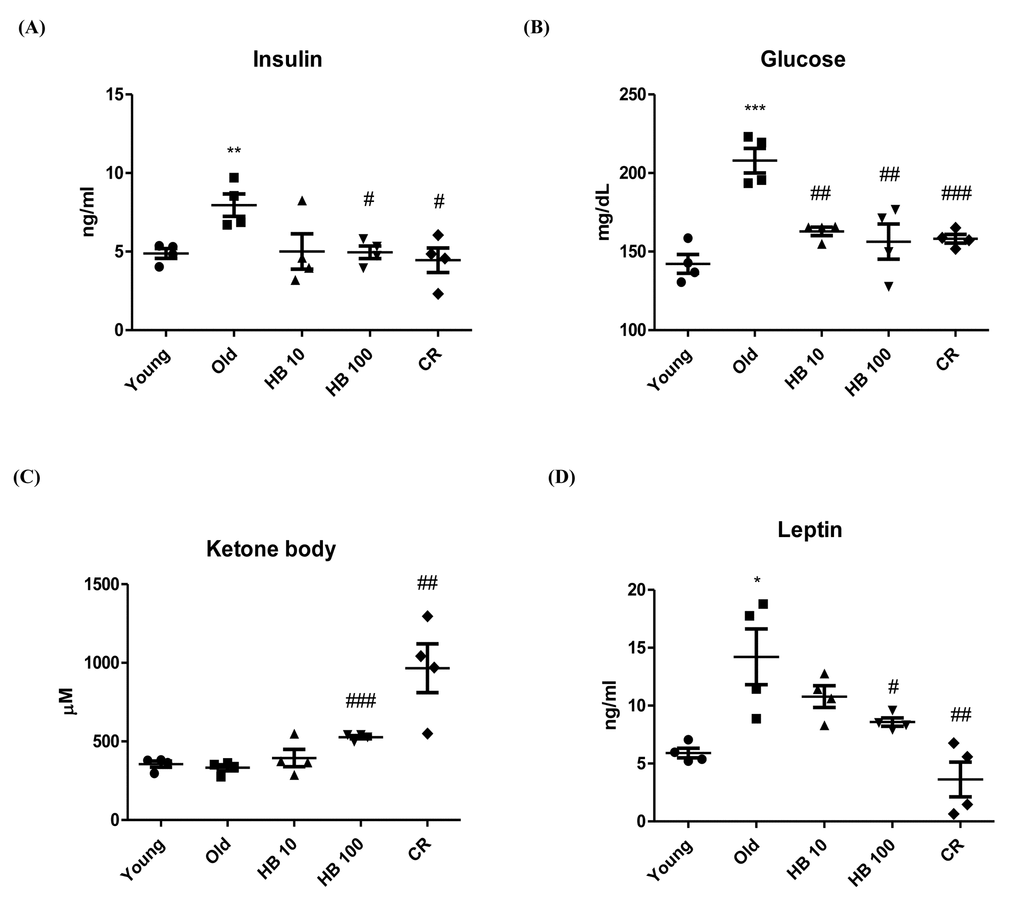 Pathogen-free male Sprague Dawley rats were obtained from Samtako (Osan, Korea) and were fed a standard laboratory diet (Superfeed Co., Wonju, Kangwon, Korea) ad libitum. Animals at 6 and 24 months of age were used as young and old rats, respectively. There were 4 rats in each experimental group. To estimate the effects of HB on inflammation, HB was injected to old rats by oral gavage (10 and 100 mg/kg/day) for 30 days. This concentration was selected based on a previous study on the regulation of sympathetic nervous system activity by ketone bodies [47]. All animal studies were designed by the Aging Tissue Bank and approved by the Institutional Animal Care Committee of Pusan National University. We followed the guidelines for animal experiments issued by Pusan National University (Approval Number PNU-2012-0088).