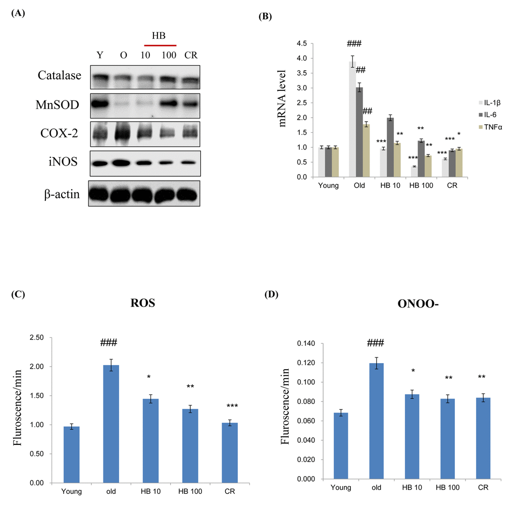 MnSOD and catalase are two major antioxidant enzymes that play a role in the protection against oxidative stress through the metabolism of ROS. In order to examine whether antioxidant protein expression levels were increased with aging and decreased by HB treatment as a CR mimetic in the kidney, western blotting was performed. The expression levels of both MnSOD and catalase were decreased, while it was reversed by HB treatment. Next, to examine age-related changes in target genes of proinflammatory NF-κB, western blot analysis using cytosolic extracts was performed. The results showed that the protein levels of COX-2 and iNOS were increased with aging in control rats, while they remained low and unchanged in the HB-fed and CR groups (Fig. 2A). However, HB treatment and CR were shown to decrease mRNA levels of IL-1β, IL-6, and TNFα compared to the levels in untreated, aged rats (Fig. 2B). In addition, HB treatment was accompanied by a decrease of ROS (Fig. 2C) and ONOO- (Fig. 2D). These data indicated a relationship between FoxO1 phosphorylation and NF-κB activity during the aging process. HB reduced aging-related inflammation via the activation of FoxO1, leading to a reduction of inflammation through the anti-aging effect of HB, which is comparable to the CR effect.