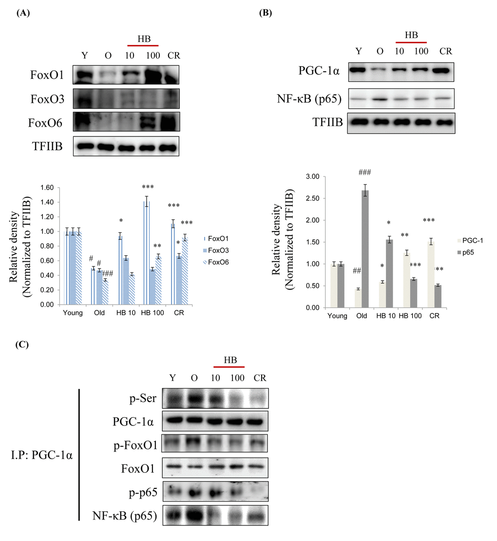 Because FoxO transcription factors play a central role in the regulation of stress response [24], we investigated their modifications during aging. As shown in Fig. 3A, the expressions of three FoxO family members, FoxO1, FoxO3, and FoxO6 decreased during aging, but this reduction was effectively counteracted by CR and HB. Furthermore, NF-κB phosphorylation levels were higher in old rats than in young rats, whereas CR and HB treated old rats showed comparatively lower NF-κB levels (Fig. 3B). PGC-1α levels were also lower in old rats, and CR and HB animals showed higher PGC-1α levels than the same aged animals (Fig. 3B). To identify the mechanism responsible for the inability of FoxO1 to undergo subcellular redistribution, we examined the association between FoxO1 and PGC-1α, a scaffold protein known to bind FoxO and modify its transcriptional activity [25]. We found decreased association between FoxO1 and PGC-1α by increased phosphorylation of serine during aging in the control animals and an increased interaction between FoxO1 and PGC-1α in the CR and HB-treated animals. Conversely, HB and CR were observed to suppress the age-related increase of phosphorylated serine of PGC-1α (Fig. 3C). These data indicate the interaction between FoxO1 and PGC-1α decreases in an aging-dependent manner, and can be reversed by CR and HB.