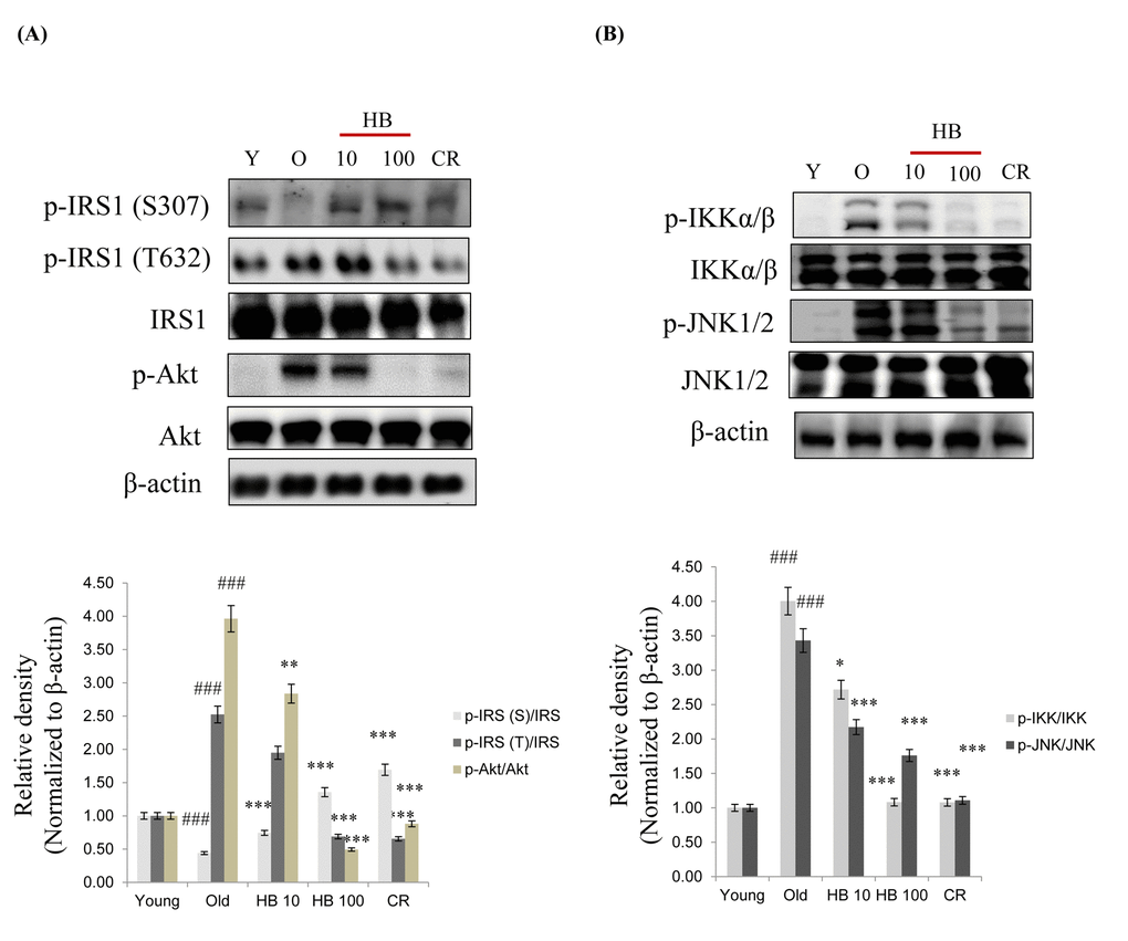 We therefore analyzed signaling molecules in the insulin pathway leading to Akt activation and increased insulin levels. Insulin activates PI3K and its downstream target Akt. Therefore, to determine whether a change in FoxO phosphorylation is caused by the activation of the PI3K/Akt pathway, phosphorylated Akt (the active form of Akt) was investigated. Although total Akt amount did not change, aging increased phosphorylation of Akt at Ser473 (Fig. 4). Conversely, HB and CR were observed to suppress the age-related increase of phosphorylated serine-Akt and tyrosine-IRS1 (Fig. 4A). However, Insulin signaling also suppressed the serine phosphorylation of the insulin receptor substrate-1 (IRS-1) and thus increased the tyrosine phosphorylation of IRS-1 as well as the serine phosphorylation of Akt in aging. On the other hand, HB and CR attenuated tyrosine phosphorylation of IRS-1 and serine phosphorylation of Akt (Fig. 4A). Next, we measured the activation of NF-κB signaling during aging. However, to determine whether a change in NF-κB phosphorylation is caused by activation of the IKK and JNK pathways, the phosphorylation of IKK and JNK was investigated. HB and CR were observed to suppress the age-related increase of phosphorylated IKK and JNK (Fig. 4B). These data suggest that PI3K/Akt signaling, upregulated by increased insulin levels might be associated with FoxO phosphorylation during the aging process, while CR or HB can reverse these phenomena.