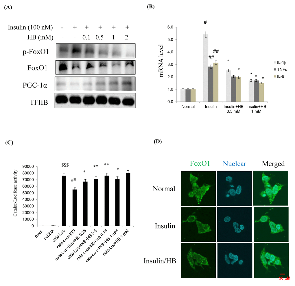 The transcriptional activities of FoxO family proteins have been reported to be increased when insulin levels were reduced [27]. We hypothesized that FoxO1 targets the catalase gene for transactivation; therefore, we examined the ability of FoxO1 to stimulate catalase expression in HEK293T cells. To examine whether FoxO1 directly regulates catalase transcriptional activity and whether HB activates this process, we performed a catalase luciferase assay after insulin treatment. Insulin significantly decreased catalase activity, and HB treatment increased catalase activity in HEK293T cells. (Fig. 5C). These observations support the idea that FoxO1 targets the catalase gene for transactivation, and thus contributes to the regulation of insulin. As shown in Fig. 5D, treatment with 100 nM insulin induced a remarkable shift of FoxO1 from the nucleus to the cytoplasm as determined by immunostaining, which was inhibited by HB. These data suggest that insulin might be associated with FoxO1 phosphorylation, leading to cytokine expression, while HB reversed these phenomena.