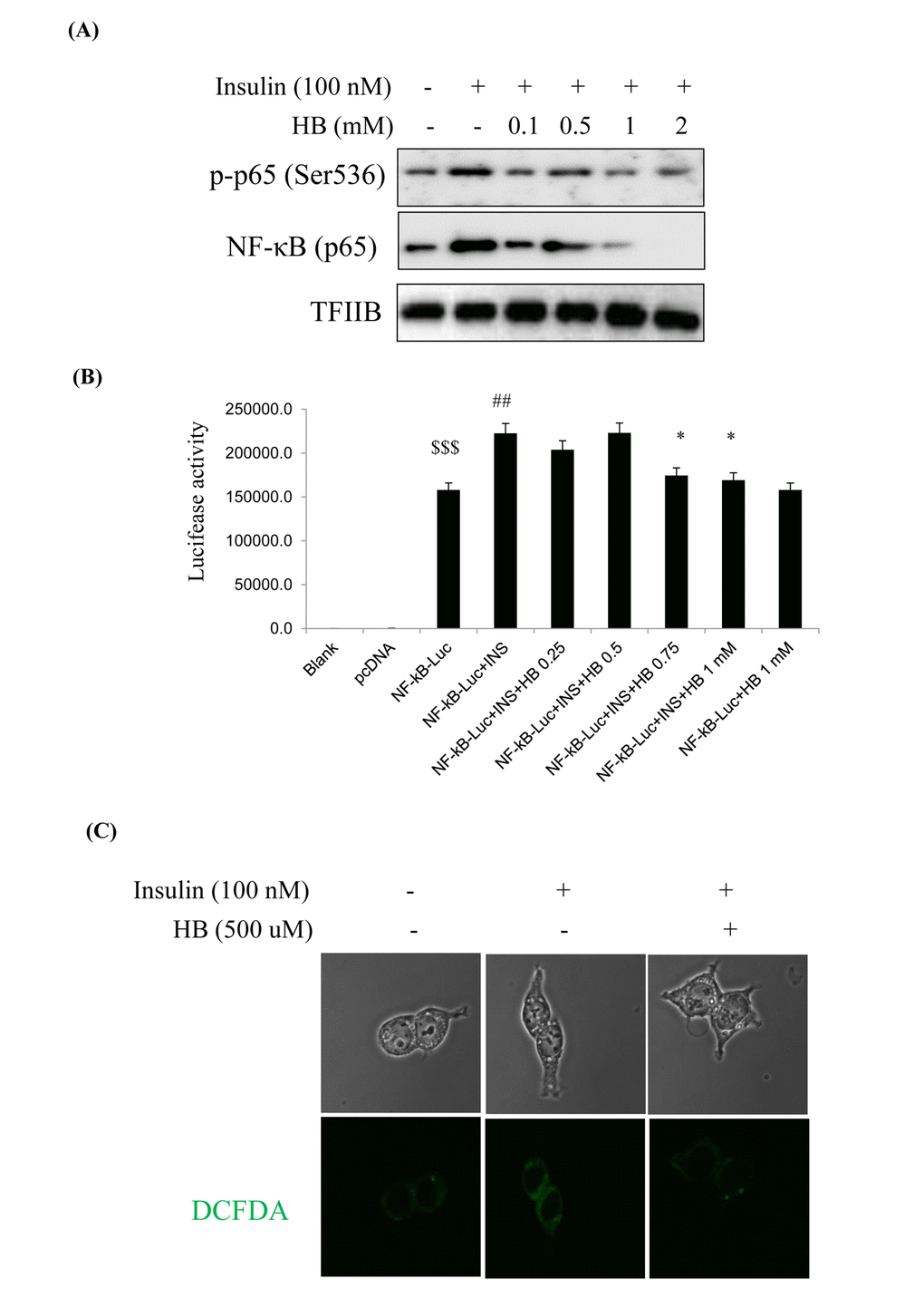 We examined the relationship of NF-κB and the insulin signaling pathway in HEK293T cells. Cells were pretreated with HB and then treated with or without 100 nM insulin in the media for 24 h. NF-κB levels and target genes were analyzed by western blotting. As shown in Fig. 6, phosphorylated p65 and NF-κB (p65) levels were increased in the nucleus in response to the insulin challenge, which were reduced by HB (Fig. 6A).