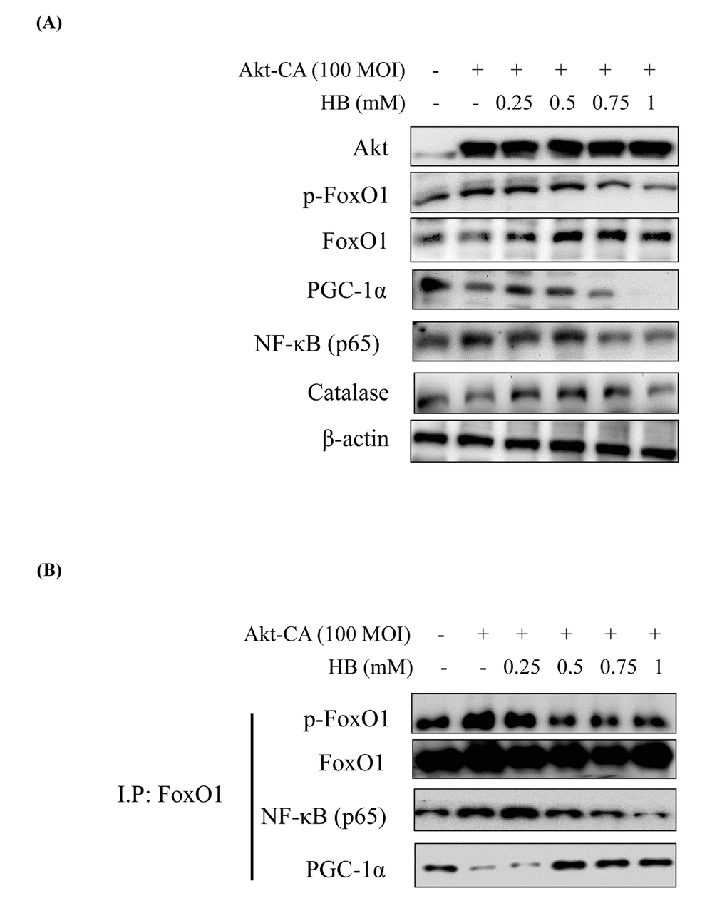 Several authors have suggested that members of the FoxO family are regulated by the PI3K/Akt pathway. More specifically, Akt, a key downstream effector of PI3K, is believed to phosphorylate FoxO proteins directly or to promote their phosphorylation by other kinases [12]. Consequently, Akt suppress PGC-1α activity by Ser570 phosphorylation of PGC-1α [28]. We examined the PI3K/Akt pathway and its effect on FoxO1 phosphorylation utilizing constitutively active Akt (CA-Akt) and measured FoxO1 phosphorylation by Akt. We found reduction in FoxO1 activity when the concentration of Akt was increased. However, PGC-1α expression was suppressed at various concentrations of the Akt vector (Fig. S7). Accordingly, we treated HEK293T cells with CA-Akt (100 MOI) for 1 day, the cells were then incubated with HB for 4 h, and then FoxO1, PGC-1α, NF-κB, and Akt levels were assessed. As shown in Fig. 7A, in HEK293T cells, FoxO1 and PGC-1α were suppressed in CA-Akt. Otherwise, FoxO1 and PGC-1α were increased, and these decreased NF-κB by HB treatment. These results indicate that the phosphorylation of FoxO1 in kidney cells was associated with the Akt activation, and HB inhibited Akt activation.