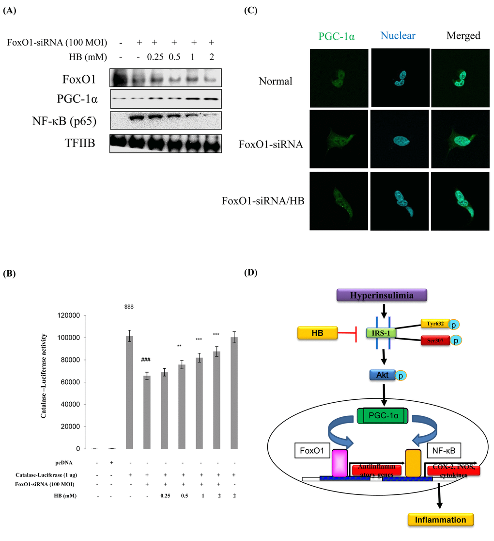 We examined PGC-1α and NF-κB genes expression in FoxO1 virus-transduced HEK293T cells. Cells were treated with or without different concentrations (100 and 200 MOI) of FoxO1-CA virus. As shown in Fig. S8, treatment with FoxO1 induced PGC-1α levels. Otherwise, NF-κB was reduced by FoxO1 activation. These data collectively indicate that proinflammatory NF-κB suppresses FoxO1 activation. To investigate the effect of HB and the relation of FoxO1 and inflammation under FoxO1 knockdown conditions, we examined the expression of inflammatory markers COX-2 and iNOS. The results showed that the HB-treated groups had higher levels of FoxO1 and PGC-1α than FoxO1 siRNA-knockdown cells (Fig. 8A). In addition, to determine the effect of HB on inflammation, we measured COX-2 and iNOS by western blotting. The results showed that HB decreased the expression of the inflammatory proteins compared with FoxO1 siRNA-knockdown cells (Fig. S9). Next, we examined the ability of HB to stimulate catalase and MnSOD expression in HEK293T cells. FoxO1 was shown to be associated with activity at the catalase promoter, as determined by a luciferase assay in FoxO1-siRNA knockdown HEK293T cells (Fig. 8B). As shown in Fig. 8C, treatment with FoxO1-siRNA induced a remarkable shift of PGC-1α from the cytoplasm to the nucleus as determined by immunostaining, while HB inhibited the translocation of PGC-1α from the nucleus to the cytoplasm.