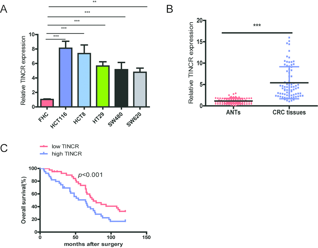 Furthermore, CRC patients with high expression of TINCR predicted a poor overall survival (OS) using the analysis of Kaplan-Meier survival curve (p<0.001).