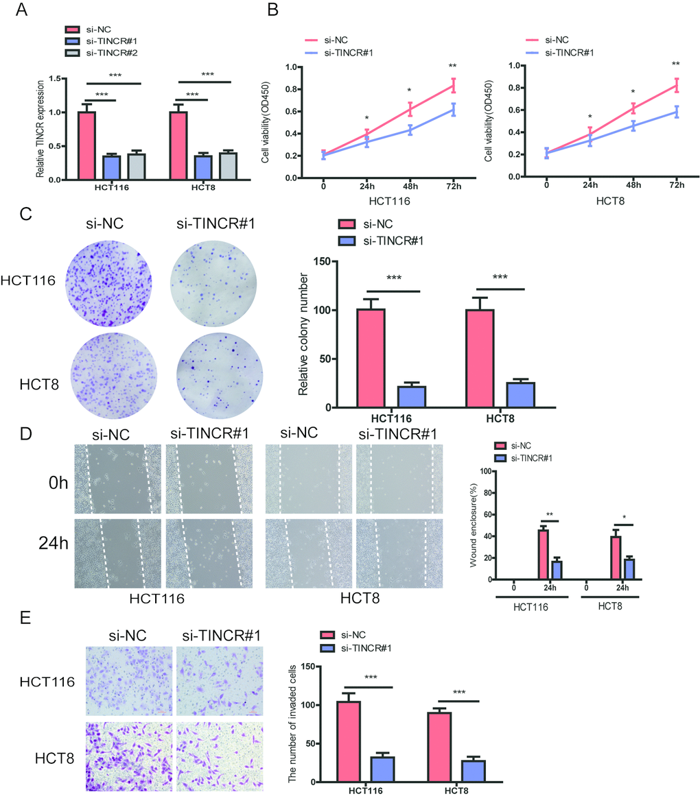 To further explore the biological role of TINCR in CRC cells, we designed two siRNAs targeting TINCR to silence TINCR expression in HCT116 and HCT8 cells. The two siRNAs obviously decreased TINCR expression levels, and we chose si-TINCR#1 for the further study due to the higher inhibitory efficiency (Fig. 3A). CCK-8 assays showed that silencing of TINCR significantly inhibited CRC cell proliferation in HCT116 and HCT8 cells (Fig. 3B). The colony formation assay revealed that TINCR knockdown markedly suppressed colony forming ability of these two cells (Fig. 3C). Moreover, wound healing and transwell invasion assay demonstrated that TINCR knockdown obviously impeded HCT116 and HCT8 cells migration and invasion (Fig. 3D, 3E), respectively.
