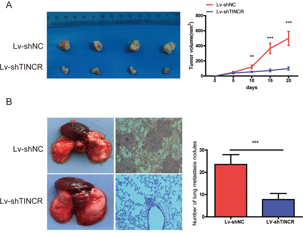 To further explore the biological function of TINCR on CRC cells in vivo, we established the xenograft mice models by injecting TINCR stable knockdown HCT116 cells. As illustrated in Fig. 4A, TINCR depletion could inhibit tumor growth. We also established the lung metastasis model via tail vein injecting cells into nude mice (n=4 for each group), as shown in Fig 4B, an average of 24 lung metastatic nodules per mouse was detected in Lv-ShNC group, while only 8 were observed in Lv-shTINCR group. Overall, these results indicate that silencing of TINCR suppresses CRC cells growth and metastasis in vivo.