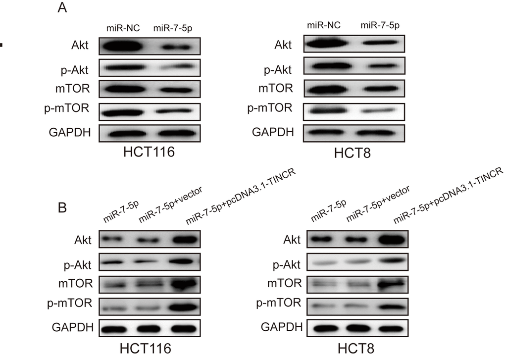 Previous studies have revealed that miR-7 regulated cell proliferation and metastasis via PI3K/Akt/mTOR signaling pathway [15–17]. Here, we found that miR-7-5p overexpression could suppress the expression of Akt and mTOR as well as phosphorylation of Akt and mTOR(p-Akt, p-mTOR) (Fig. 7A), while TINCR upregulation could restore the expression of Akt, mTOR, p-Akt and p-mTOR (Fig. 7B). Therefore, we could speculate that TINCR may promote CRC progression via miR-7-5p-mediated PI3K/Akt/mTOR signaling pathway.