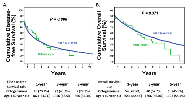 Statistical analysis was performed using IBM SPSS Statistics 21 (IBM Corporation, Software Group, Somers, NY, USA). Student’s t test or Mann-Whitney U test was used to analyze continuous variables. Fisher’s exact test or Pearson’s χ2 test was used to analyze categorical data. Kaplan-Meier analysis was used to determine the OS and DFS. The log-rank test and Cox proportional hazard regression multivariate analysis were adopted to determine prognostic significance of clinicopathological variables in the octogenarian group. Values of P < 0.05 in two-sided tests were considered significant.