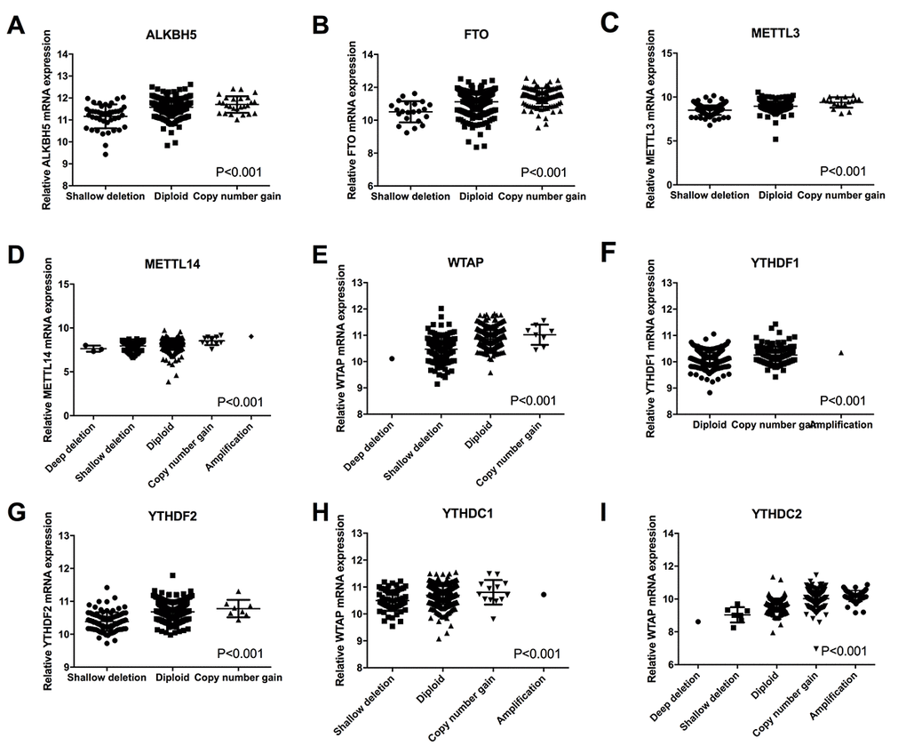 All statistical data and figures were analyzed by using SPSS 20.0 (IBM, Chicago, USA) and GraphPad Prism 6.0 (GraphPad Software, La Jolla, CA, USA). The association between m6A regulatory genes’ CNV and clinicopathological characteristics were analyzed with chi-square test or Mann-Whitney U test. Kaplan-Meier curve and log-rank test were used to evaluate the prognosis value of m6A regulatory gene’s alteration. Cox proportional hazard regression model was performed using SPSS. All statistical results with a p-value <0.05 were considered to be significant.