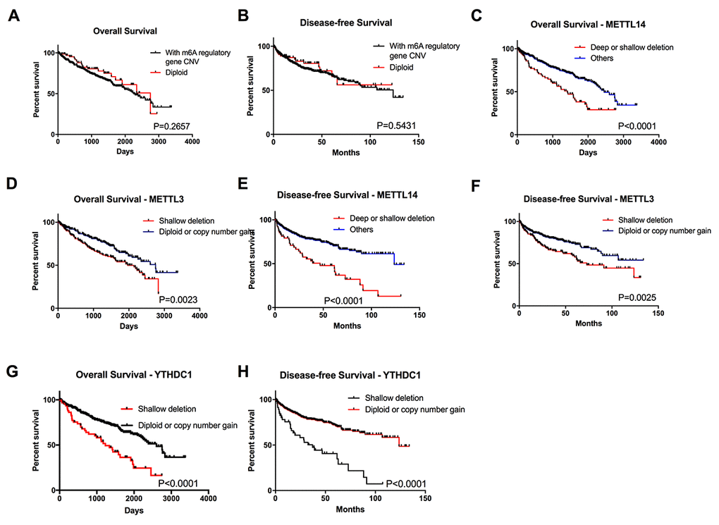To explore the prognostic value of CNVs in the m6A regulatory genes, we analyzed the effects of CNVs on the overall survival (OS) and disease-free survival (DFS) among ccRCC patients, and found that individuals with or without m6A regulatory genes’ CNVs didn’t have any correlation with OS and DFS (Figure 3A-B). Furthermore, separate analysis of the ten genes revealed that patients affected by deletions of YTHDC1, METTL14 or METTL3 (one reader and two writer genes of m6A) had poorer OS and DFS (Figure 3C-H); while, no significant difference was observed between different subgroups based on the CNVs of the other ten m6A regulatory genes (Figure S2). Multivariate Cox regression analyses demonstrated that alteration of m6A regulator genes was an independent risk factor for overall survival (Table 5). Considering the writer genes are a group of methyltransferase enzymes and the most important part in m6A regulation process, the results implied that the down-regulation of m6A level might be associated with poor patient survival.