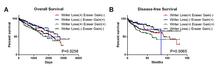In order to confirm the above conclusion, we next tested it among patients who were affected by two kinds of CNVs (deletions of writer genes and copy number gain of eraser genes). As the result showed, patients with deletions of writer genes in combination with copy number gain of eraser genes had worse OS and DFS than those with only deletions of writer genes (Figure 4A-B). This provided more evidence for the relationship between down-regulated m6A level and poor survival.