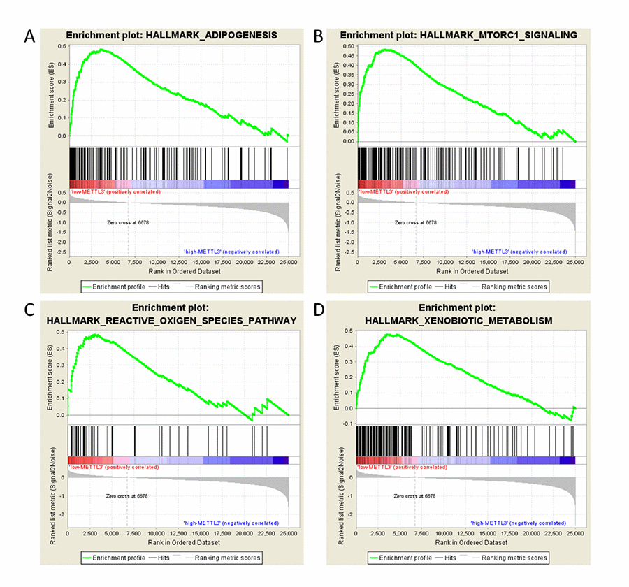 GSEA was provided by the JAVA program with MSigDB v6.1 and downloaded from the website of Broad Institute [37]. In this study, cases were divided into two groups according to the first and fourth quartile of METTL3 expression level. Finally, 18419 genes were enrolled into the GSEA process. Hallmark gene set “h.all.v6.0.symbols.gmt” was used in this study [38]. Gene sets with normalized p-value <0.05, and the false discovery rate (FDR) <0.25 were considered to be significantly enriched.