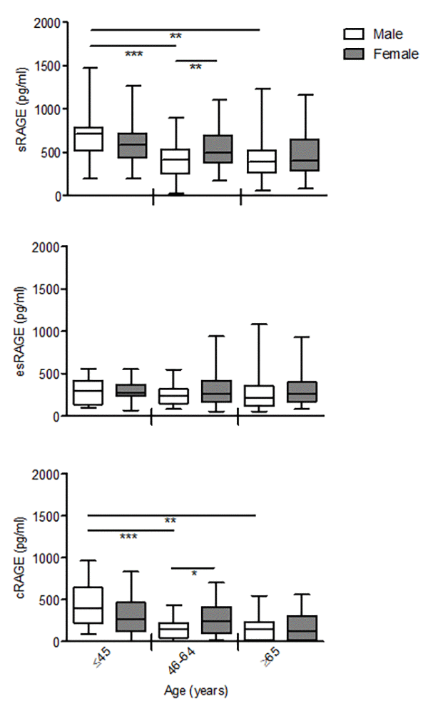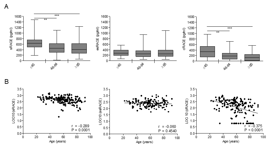In the present study, we simultaneously determined both sRAGE isoforms, esRAGE and cRAGE, and some of their ligands such as AGEs, HMGB1 and S100A8/A9 in a cohort of healthy subjects ranging from 20- to 90- years, with the aim to disentangle their age-related trends.