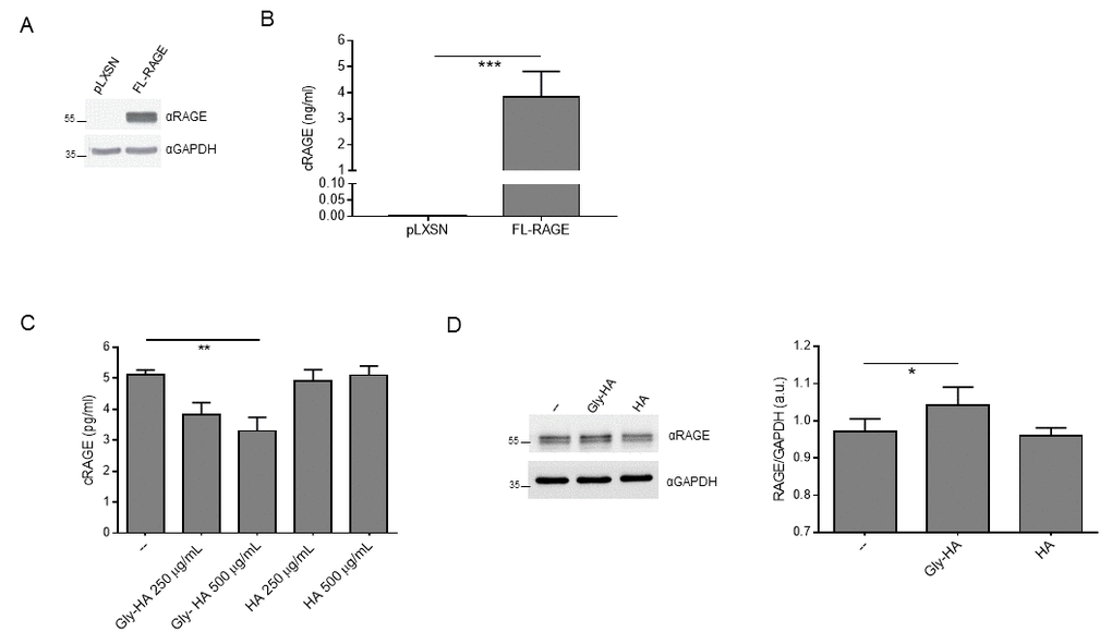 Two thousand R3/1-pLXSN or R3/1-FL-RAGE clones were seeded on 6 well-plate (Costar, Kennebunk, ME, USA) and treated with indicated concentration of human glycated Albumin (HGA; #A8301, Sigma Aldrich, Saint Louis, Missouri, USA) or not-glycated human Albumin (HA; #A7736, Sigma Aldrich) as control in DMEM supplemented with 0.1% FBS for 6 hours. Supernatant of cells was tested for cRAGE concentration by a commercial ELISA (DY1145, Human RAGE DuoSet ELISA, R&D Systems Inc., MN, USA). Cells were harvested in RIPA buffer in the presence of proteases inhibitors (P8849, Sigma-Aldrich), incubated in ice for 30 min and centrifuged at 12000g for 15 minutes at 4°C. Protein extracts were separated by SDS-PAGE and transferred to Amersham Hybond ECL Nitrocellulose membranes (GE Healthcare, Little Chalfont, United Kingdom). Membranes were incubated with a goat anti-human RAGE (1 µg/ml; cat. AF1145; R&D Systems Minneapolis, MN, USA) or an antibody against GAPDH (0.2 µg/mL, sc-25778, Santa Cruz Biotechnology) as a loading control. Proteins were visualized by an enhanced chemiluminescence (ECL) detection system (cat. RPN2106, GE Healthcare) and acquired with a ChemiDoc™ MP Imaging System (Biorad, Hercules, CA, USA). Protein bands were quantified by densitometry analysis using ImageJ.