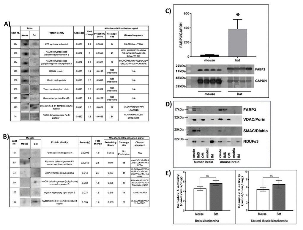 We wished to gauge whether the biochemical composition of mitochondria in bat brain is markedly different to mitochondria in the mouse brain. We report the top nine proteins that have significantly different relative quantities when comparing the bat and mouse brain mitochondrial proteomic profiles (Figure 1A). Quantities of tropomyosin alpha-1 chain, cytochrome b-c1 complex subunit Rieske and NADH dehydrogenase iron-sulphur protein 1 are relatively higher in the bat brain mitochondrial proteome compared to the mouse (p<0.05). Whilst, ATP synthase subunit d, NADH dehydrogenase flavoprotein 2, NADH dehydrogenase iron-sulphur protein 3, RAB14, myelin basic protein and Ras-related protein are each significantly relatively more abundant in the mouse brain mitochondrial proteome (p<0.05). We measured more ATP synthase subunit d (2 fold) in the mouse brain mitochondrial proteome in comparison to the bat (p=0.0001). Mitoprot probability scores for mitochondrial import are calculated for spot numbers 194, 180, 174, 173 and 74. The proteins identified from these spots have sequence motifs that support a localisation in the mitochondrial compartment.