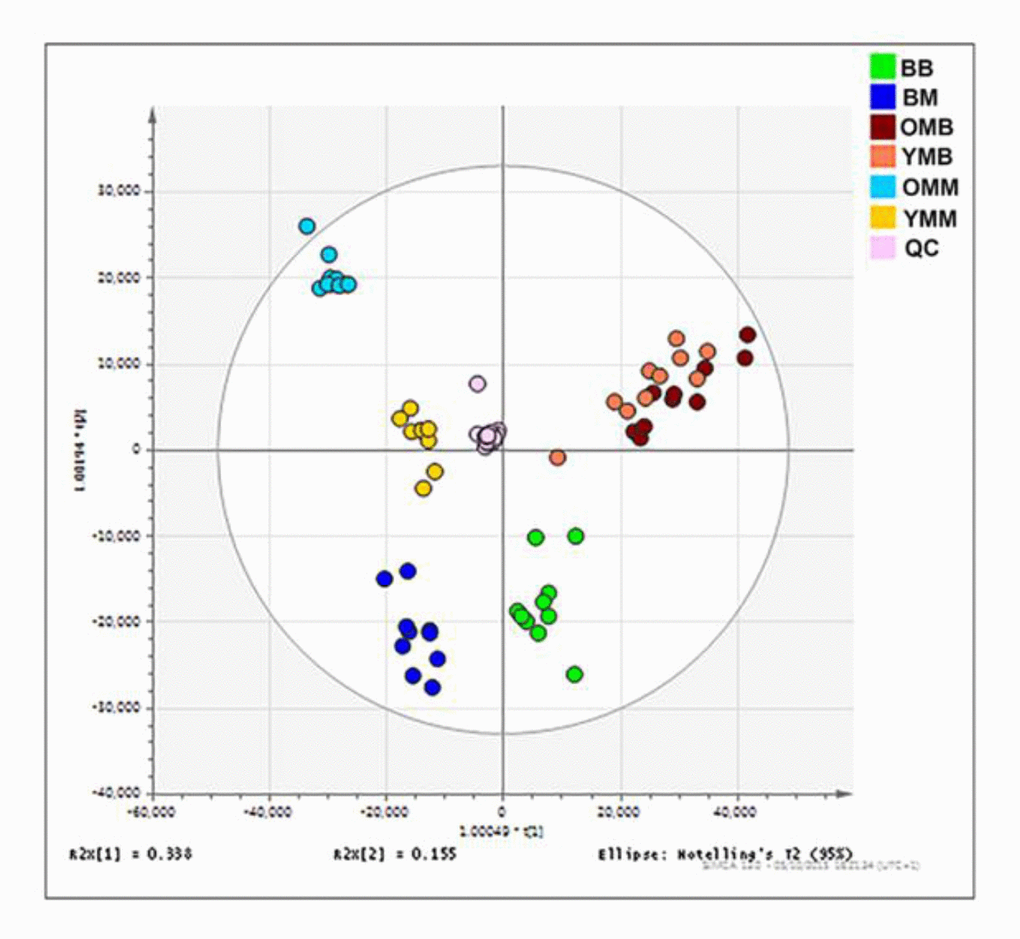 Previously we have reported that mitochondrial lipid profiles are tissue and age specific [22]. We wished to see how the mitochondrial lipid profile from this exceptionally long-lived species compared with the mouse. Orthogonal partial least square-discriminant analysis (OPLS-DA) was performed on the lipidomics data derived from bat and mouse brain and skeletal muscle mitochondria (Figure 2). There are distinct lipid compositional profiles obtained from the mitochondria from the two mammals and also from the two different tissue types. The three groups of muscle data are clustered though there is a distinct separation of the young (YMM) and older mouse muscle (OMM) lipid profiles. It appears that the YMM profile is relatively closer to that of the bat muscle (BM). For the brain profiles on these axes we find that the young and old brain profiles are close in the mouse. The bat brain lipids can be seen to cluster in the same (lowest) section of the plot as the bat muscle samples. Therefore, species can now be added to age and tissue type as a determinant of mitochondrial lipid profile [22].