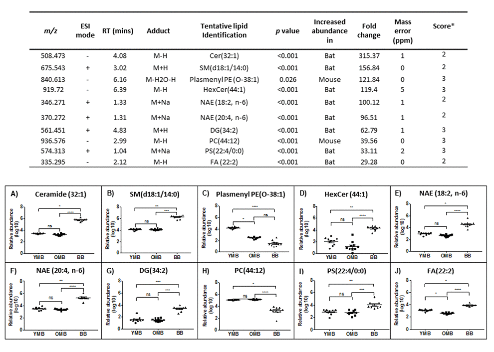 Ceramide tops the list of the top ten brain mitochondrial lipids with different abundances between bat and mouse