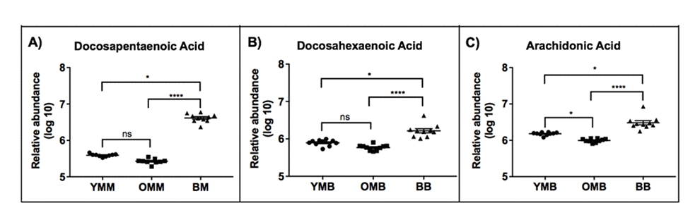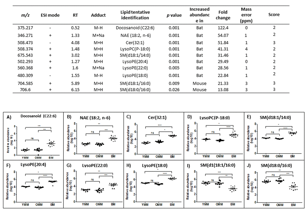 To examine mitochondrial lipid differences between bat and mouse we used ultra-high performance liquid chromatography coupled with high-resolution mass spectrometry to separate and identify lipid contents of mitochondrial fractions from brain and muscle. Ceramide (32:1), N-acylethanolamines (18:2 and 22:6) and a docosanoid species were identified within the top six lipid species, each more abundant in the bat mitochondrial fractions. We noticed that lipid species known to be metabolic precursors of lipid mediators of inflammatory processes, particularly the N-acylethanolamines, DPA, DHA and AA are found to be highly abundant in bat mitochondria when compared with young or older mouse mitochondrial lipids [34,35]. This finding may support the idea of a central function for these lipids in the longer maintenance of healthy mitochondria. Importantly these identified lipids can each be transported by FABP3 which was shown to be upregulated in the bat muscle fractions [36]. Our data measuring higher levels of DHA in the bat mitochondria appear to contrast with data from membranes isolated from naked mole-rat which have been found to contain lower levels of DHA [37]. It was suggested the lower levels of DHA are protective in the mole-rat since this reduces the potential for lipid peroxidation. Therefore, our observations either reveal an alternative protective strategy where larger quantities of DHA offset the functional losses through peroxidation, or alternatively that whole mitochondrial content cannot necessarily be compared with isolated membrane fractions. It should also be considered that the two different mammals have very different diets. Naked mole-rats eat roots and tubers whereas the bats we are studying are insectivorous. There is a large body of data showing the beneficial effect of dietary DHA on ageing tissues and membranes therefore large quantities could be perceived as protective [34,38].