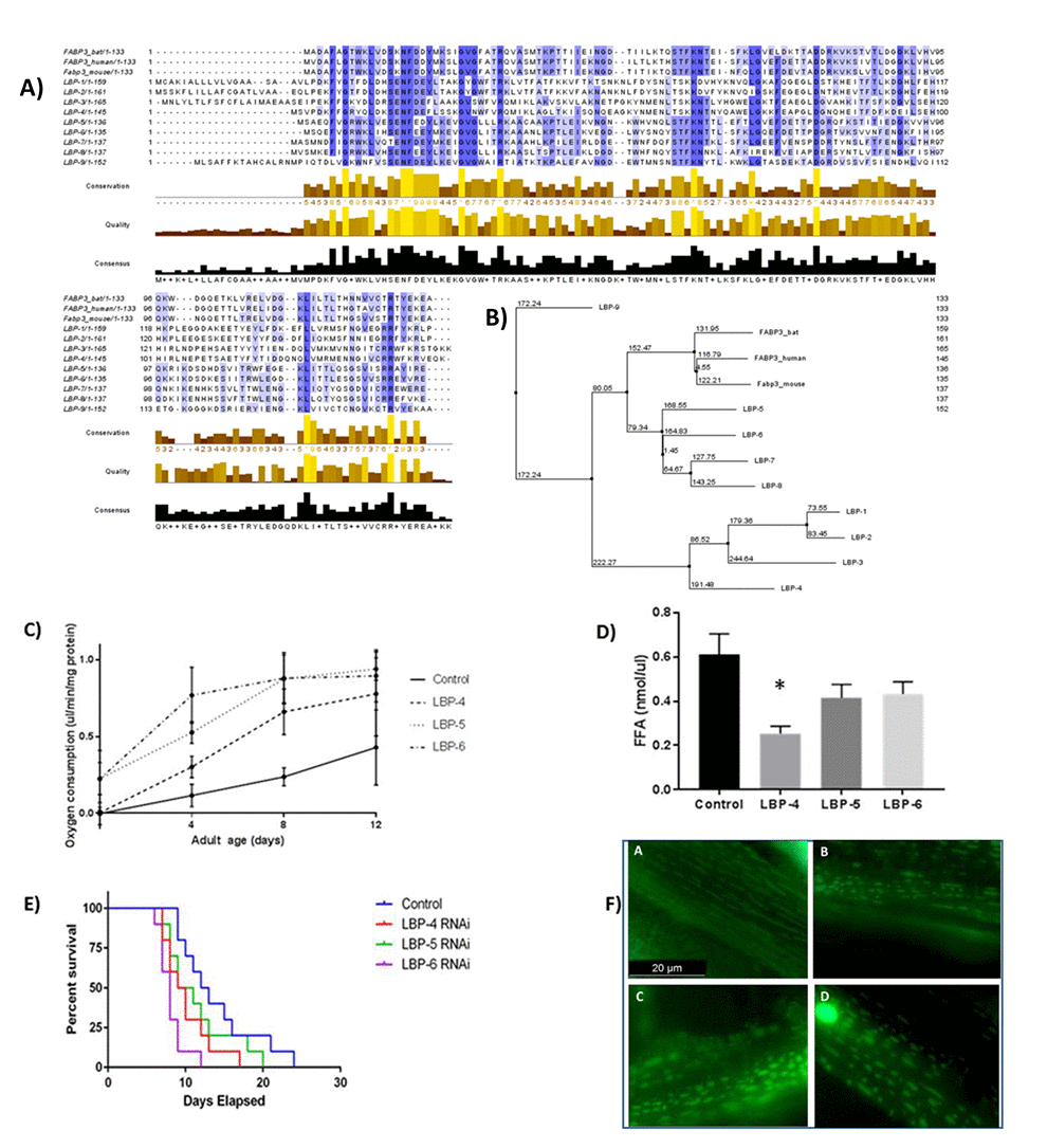 In order to see whether our protein findings concur with lipidomics data we chose to focus on a potential mitochondrial role for FABP3 (found to be significantly more abundant in bat skeletal muscle mitochondria) in regulating mitochondrial lipids and thereby lifespan. This work was done in the nematode worm to facilitate monitoring of lifespan changes. We identified fatty acid binding protein orthologues in C. elegans. Sequence homology and phylogeny confirm their similarity to FABP3 (Figure 6A and B and Supplementary Table 1). RNAi knockdowns of each of LBP4, 5 and 6 were generated and their lifespans recorded. The LBP6 knockdown worms appear to have a shortened lifespan (Figure 6E). Measurement of free fatty acid quantities in the LBP knock downs confirmed a reduction in free fatty acid abundance in each of the orthologue knock-downs, reaching significance in LBP-4 (p value = 0.027).