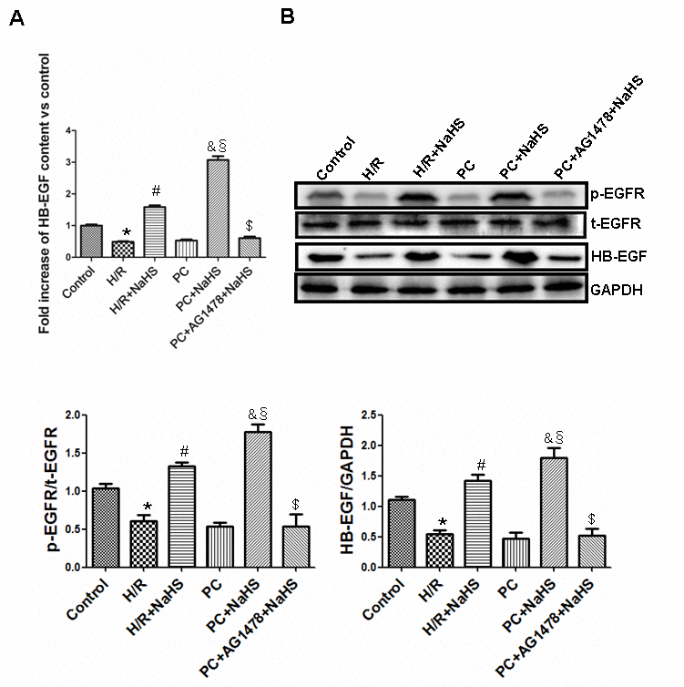 H/R markedly reduced HB-EGF expression and content in aged H9C2 cells, and that effect was reversed by treatment with NaHS. H/R also reduced EGFR levels, and that effect too was reversed by NaHS. The suppressive effects of H/R on HB-EGF and EGFR in the PC group were similar to those in the H/R group. Addition of NaHS to cells in the PC group significantly (p<0.05) increased HB-EGF and EGFR, and their levels the PC + NaHS group were higher (p<0.05) than in the H/R + NaHS group. The beneficial effects of PC + NaHS on HB-EGF and EGFR levels were inhibited by AG1478 (an EGFR antagonist), suggesting they were mediated via HB-EGF/EGFR signaling (Figure 1).