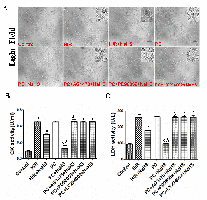 The photomicrographs in Figure 2A show that H9C2 cardiomyocytes in the control group were intact, granule-free, and grew in clusters. In the H/R group, the cell-to-cell adhesion among cardiomyocytes was lower, and the cells were more dispersed. In addition, the cells appeared collapsed. Compared with the H/R group, the cellular morphology of cardiomyocytes in the H/R + NaHS group was much improved. The appearance of cells exposed to H/R in the PC group was similar to that in the H/R group – i.e. PC alone had little protective effect against H/R in these aged cells. On the other hand, the beneficial effect of PC + NaHS on the morphology of cells exposed to H/S was even stronger than that of NaHS alone. This beneficial effect of PC + NaHS was inhibited by AG1478, PD98059 (an ERK1/2 inhibitor) or LY294002 (a PI3K inhibitor). Figure 2B and C show that H/R induced similar significant (p<0.05) increases in lactate dehydrogenase (LDH) and creatine kinase (CK) activities in untreated cells and cells treated with PC. Addition of NaHS to the PC-treated cells exposed to H/R led to marked (p<0.05) decreases in both LDH and CK activities. This inhibitory effect of PC + NaHS on LDH and CK activities was blocked by AG1478, PD98059, or LY294002.