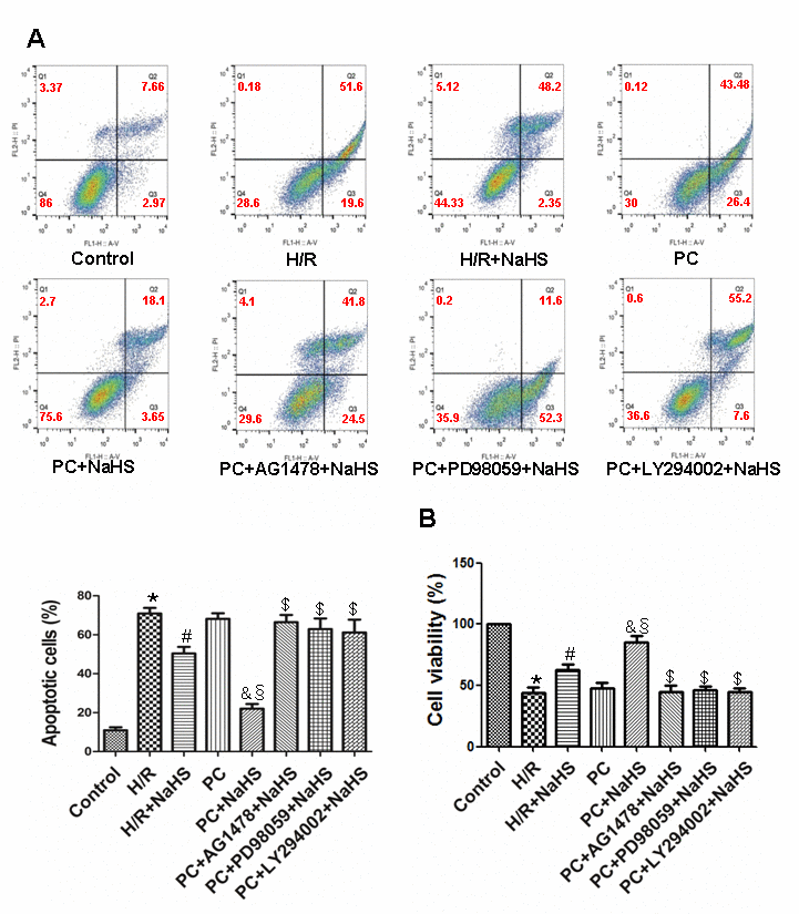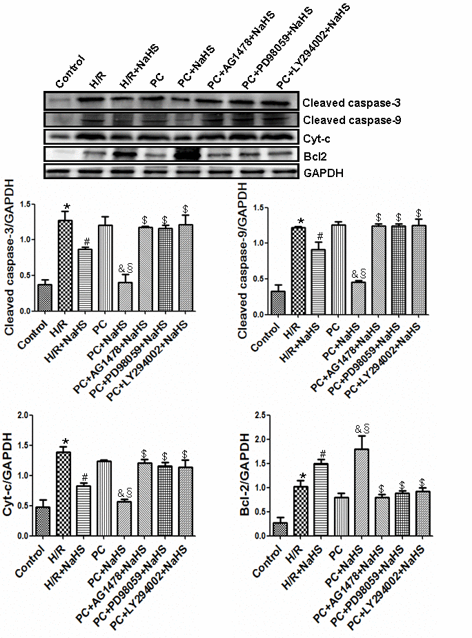 Compared to control cells, the viability of H9C2 cells exposed to H/R was reduced and the apoptotic rate was increased, as were levels of cleaved caspase-3, cleaved caspase-9, Cyt-c, and Bcl-2 (p<0.05) (Figures 3 and 4). H/R had similar effects on cells in PC group. However, those adverse effects of H/R were significantly reversed in the PC + NaHS group (p<0.05). Moreover, the beneficial effects of PC + HS was significantly (p<0.05) greater that those of NaHS alone. And again the beneficial effects of PC + NaHS were blocked by AG1478, PD98059, or LY294002.