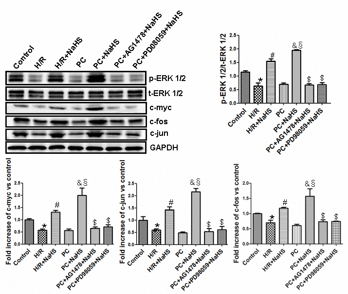 The activity of phosphorylated (phospho)-ERK1/2 and expression of the proto-oncogene transcription factors c-myc, c-fos and c-jun were significantly (p<0.05) lower in aged H9C2 cardiomyocytes exposed to H/R than untreated control cells, and similar suppression was seen the PC group (Figure 5). Addition of NaHS to the H/R-exposed cells significantly (p<0.05) increased phospho-ERK1/2 activity and proto-oncogene expression in both the H/R + NaHS and PC + NaHS groups, but the increases were significantly (p<0.05) greater in the PC + NaHS group. The effects of NaHS were blocked by the ERK1/2 inhibitor PD98059 or the EGFR antagonist AG1478. Although its activity varied, the total amount of ERK1/2 did not differ among the different treatment conditions (Figure 5).