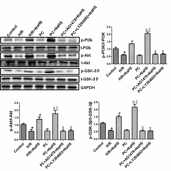 Levels of phosphorylated PI3K, Akt and GSK-3β were lower (p<0.05) in the H/R group than in the control group (Figure 6). Compared with the H/R group, levels of phosphorylated PI3K, Akt and GSK-3β were significantly (p<0.05) increased in cells treated with H/R + NaHS. The reductions in phosphorylated PI3K, Akt and GSK-3β seen in the PC group were similar to those in the H/R-only group, but the levels were significantly increased by addition of NaHS. In addition, levels of phosphorylated PI3K, Akt and GSK-3β were significantly (p<0.05) higher in the PC + NaHS group than the H/R + NaHS. These beneficial effects of NaHS were blocked by the PI3K inhibitor LY294002 or AG1478. The total amounts of PI3K, Akt and GSK-3β detected did not differ among the treatments (Figure 6).