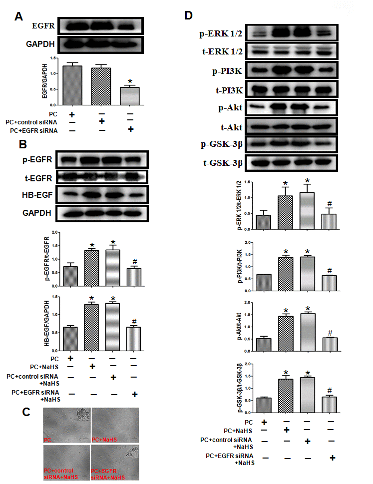 To further confirm whether that H2S restores PC-induced cardioprotection by up-regulating HB-EGF/EGFR signaling, EGFR was knocked down using targeted siRNA in aged H9C2 cells (Figure 7A). Knocking down EGFR inhibited the beneficial effects of NaHS on cell damage and the HB-EGF/EGFR, ERK1/2 and PI3K-Akt-GSK3β signaling summarized above (Figure 7B-D). The total amounts of EGFR, ERK1/2, PI3K, Akt and GSK-3β all remained unchanged under the different treatment conditions.