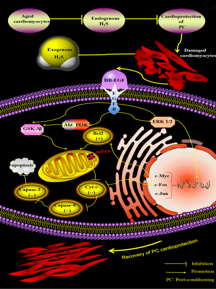 In summary, our results suggest that exogenous H2S restores PC-mediated protection of aged cardiomyocytes by upregulating HB-EGF/EGFR signaling, which in turn upregulates activity in the ERK1/2-c-myc (and fos and c-jun) and PI3K-Akt-GSK-3β pathways in the aged cardiomyocytes (Figure 8). These findings provide insight into the mechanisms underlying recovery of the beneficial effects of PC in aged hearts treated with exogenous H2S and opens a window for innovative H2S-based treatment strategies for aged patients with ischemic cardiovascular diseases.