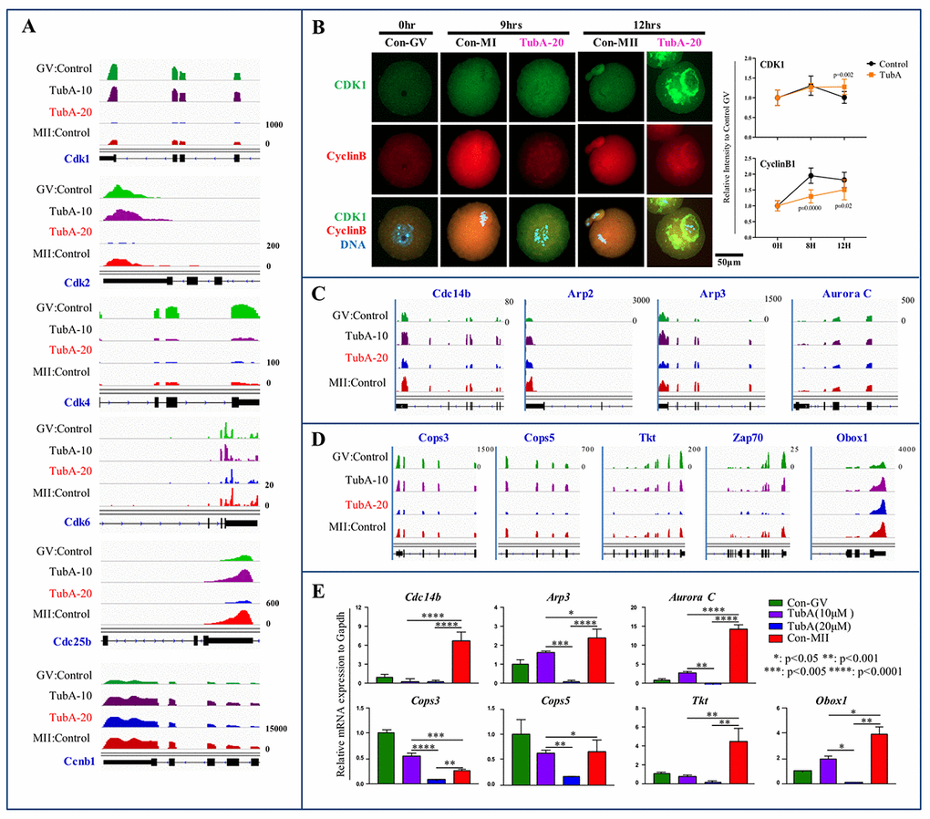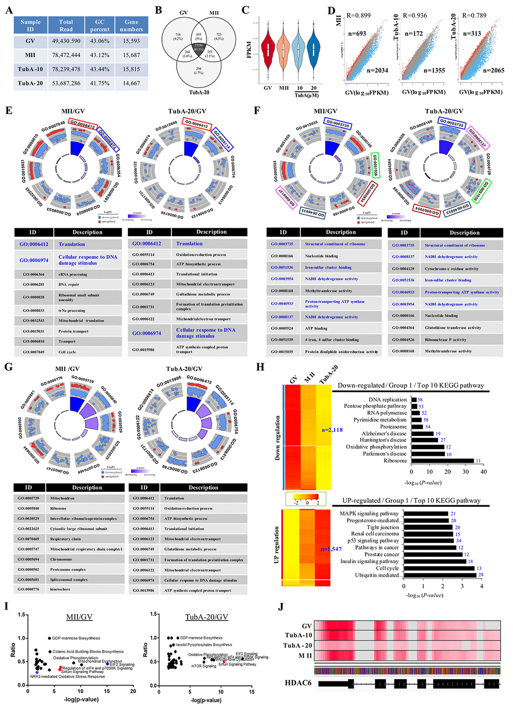In vitro oocyte maturation in the presence of 20 μM TubA (p<0.05) is arrested at the MI or ATI stage, and shows abnormal spindle and chromosome alignment [15]. Here, we performed single oocyte RNA-Seq and analyzed the in silico data to address several unanswered questions regarding TubA effects and to determine the epigenetic effects of TubA on oocyte maturation and viability. Additionally, we used the R package GOplot, KEGG, and IPA analysis to identify the underlying mechanism of TubA-induced abnormal oocyte maturation.