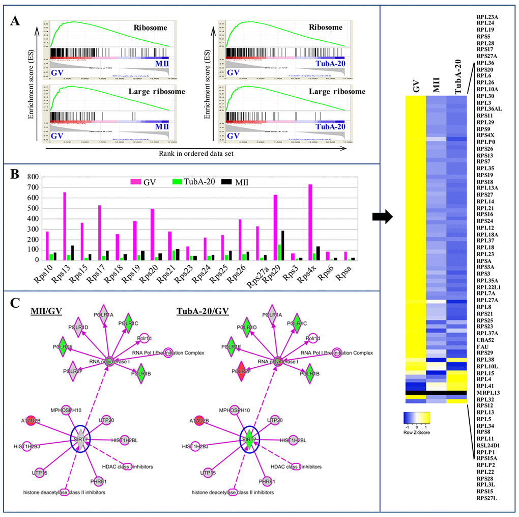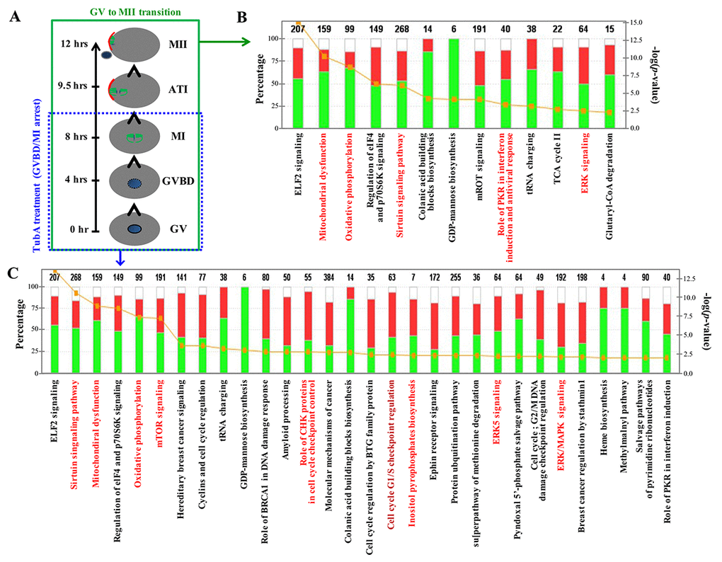 After RNA-seq quantification of the normalized data, we examined DEG profiles between control (GV or MII) and TubA-treated groups. The number of up- and downregulated DEGs in the top 10 enriched pathways are shown in Supplementary Table 1 and 2. Of note, metabolic-related pathways (pentose phosphate, pyrimidine metabolism, oxidative phosphorylation, and ribosome pathways) in the TubA-treated group were strongly downregulated. However, the top 10 upregulated KEGG pathways in the TubA-treated group were MAPK signaling, progesterone-mediated oocyte maturation, p53 signaling, insulin signaling, and cell cycle (Supplementary Table 1). As shown in Fig. 2B and C, IPA canonical pathway analysis showed that EIF2 signaling, mitochondrial dysfunction, oxidative phosphorylation, regulation of EIF4 and p70S6K signaling, Sirtuin signaling, colanic acid building block biosynthesis, GDP-mannose biosynthesis, mTOR signaling, role of PKR in interferon, induction and antiviral response, tRNA charging, and ERK signaling were simultaneously affected in both the MII/GV and TubA/GV pairs. However, a significant proportion of the genes in TubA-treated oocytes were enriched in cell cycle-related pathways (cyclins and cell cycle regulation, role of BRCA1 in DNA damage response, CHK proteins in cell cycle checkpoint control, cell cycle regulation by BTG family proteins, cell cycle G1/S checkpoint regulation, G2/M DNA damage checkpoint regulation, and MAPK/ERK signaling). The observed dysregulation of these genes would be expected to prolong cell cycle checkpoint signaling leading to a further delay or block in entry into meiosis.