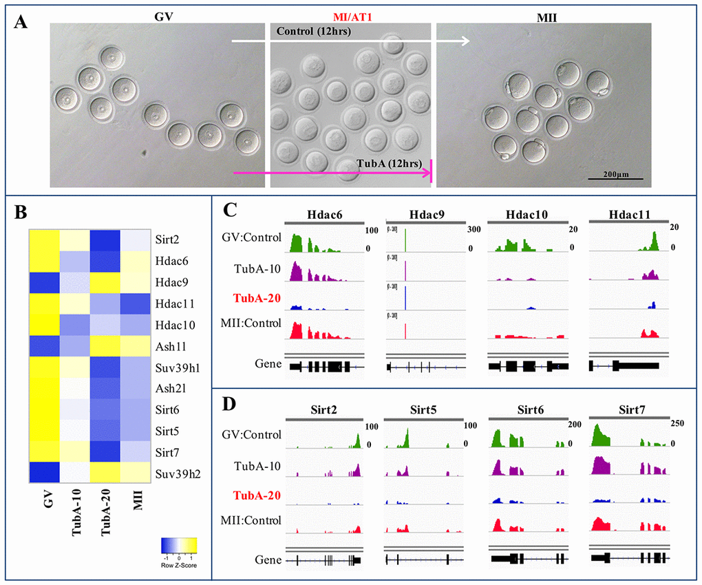 Female mice were injected with 5 IU pregnant mare serum gonadotropin (PMSG) and were sacrificed 48 h after PMSG injection. Germinal-vesicle (GV) oocytes were collected using a mouth pipette. Cumulus cells were dispersed with hyaluronidase (300 IU/mL) for 3-5 min in M16 medium. Denuded oocytes were rinsed thoroughly 5 times in M16 medium and then randomly cultured in M16 medium with or without 10 or 20 μM TubA, after covering with sterile mineral oil, under 5% CO2 at 37°C for 12 h. TubA (Catalogue no. 27108) was obtained from BPS Bioscience (San Diego, USA) and dissolved in DMSO. In this study, TubA was used at a final concentration of 10 or 20μM, as previously described [15]. In vitro-matured MII oocytes were collected if they had a polar body extrusion, and subjected to further analyses.