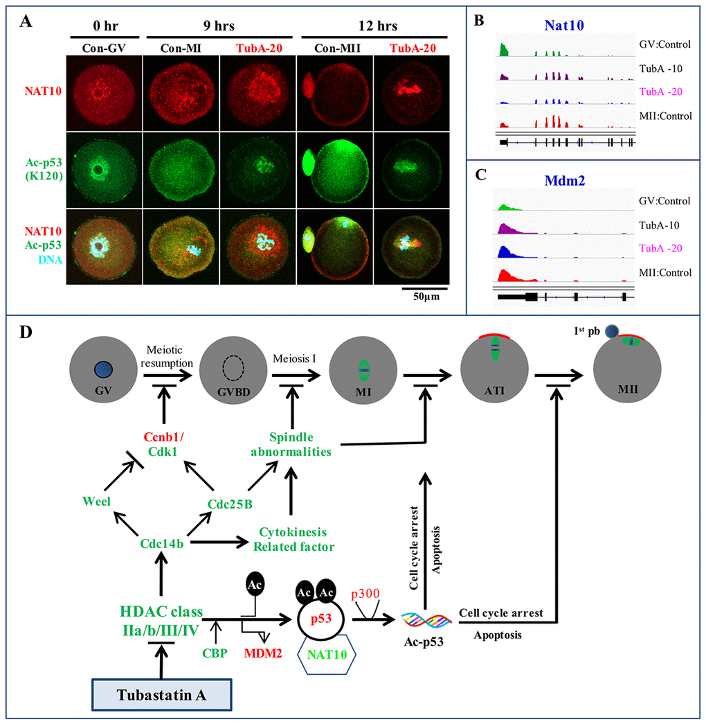 In control oocytes, NAT10 protein expression patterns was changed from the nucleolus in GV oocytes to the cytoplasm in MI oocytes, and the membrane and first polar body of MII-stage oocytes (Fig. 6A). Nine hours after TubA supplementation, however, NAT10 protein staining was strongly localized to the peri-nucleus including the cytoplasm. After 12 h, NAT10 protein staining became limited to the peri-chromosomes. Of note, Ac-p53 (K120) staining patterns in both the control and TubA-treated groups were very closely correlated with those of NAT10. In addition, Nat10 mRNA expression in the TubA-treated groups decreased slightly, whereas Mdm2 mRNA expression was similar to control MII-stage oocytes (Fig. 6B and C). Collectively, immunostaining patterns in the TubA-treated groups demonstrate that nuclear NAT10 and Ac-p53 (K120) were correlated with the poorest outcome of meiotic exit compared to cytoplasmic and membrane-associated NAT10 and Ac-p53 (K120), indicating that the subcellular distribution may be important for the progression of meiotic oocyte maturation.
