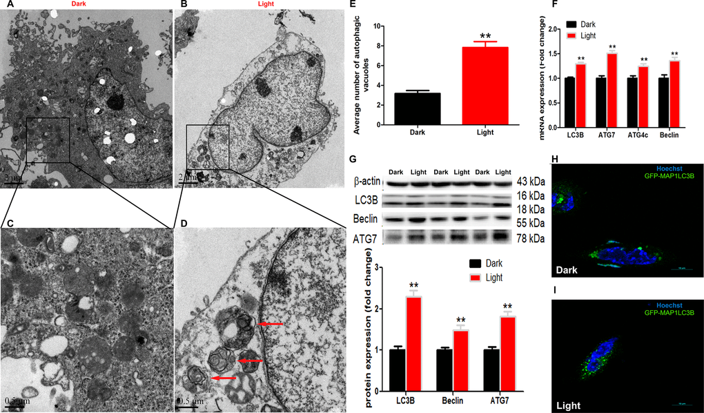 White LED light-induced autophagy in hippocampal neuron cells was demonstrated by using different methods. Firstly, transmission electron microscopy (Figure 1A–1D) demonstrated that the number of autophagic vacuoles was significantly increased (p < 0.01) in Light group (Figure 1E). Secondly, autophagy-related genes, such as LC3B, Beclin and ATG7, were significantly (p < 0.01) up-regulated in Light group at both mRNA (Figure 1F) and protein (Figure 1G) levels. Thirdly, the GFP-LC3B immuofluorescence was significantly increased (Figure 1H–1I) in light-exposed cells transfected with the GFP-tagged MAP1LC3B expression plasmid (GFP-MAP1LC3B). Furthermore, blocking the autophagy with 3-MA, an early stage autophagy inhibitor, rescued light-induced decrease of cell viability, in a dose-dependent manner (Supplementary Figure 2).
