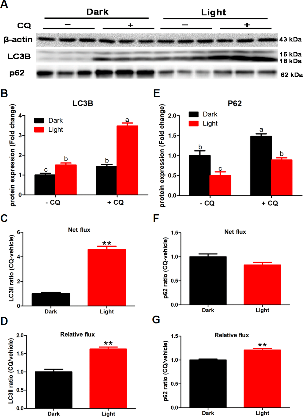 To detected the effect of white LED light on autophagy flux, we added 50 μM chloroquine (CQ) in the last 2 h of white LED light exposure. CQ significantly increased LC3II and p62 protein levels (p < 0.01) both in Dark and Light group (Figure 2B and 2E). Meanwhile, white LED light exposure significantly increased (p < 0.01) LC3II flux both in net flux and relative flux (Figure 2C and 2D). Concurrently, white LED light exposure significantly increased (p < 0.01) the relative flux of p62 (Figure 2G), yet not influence net flux of p62 (Figure 2F).
