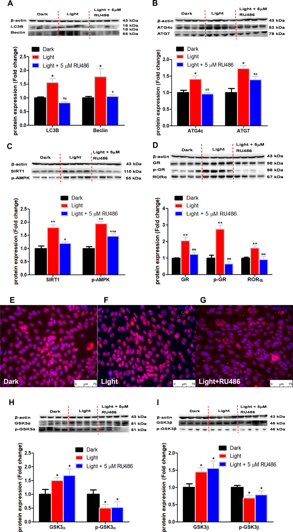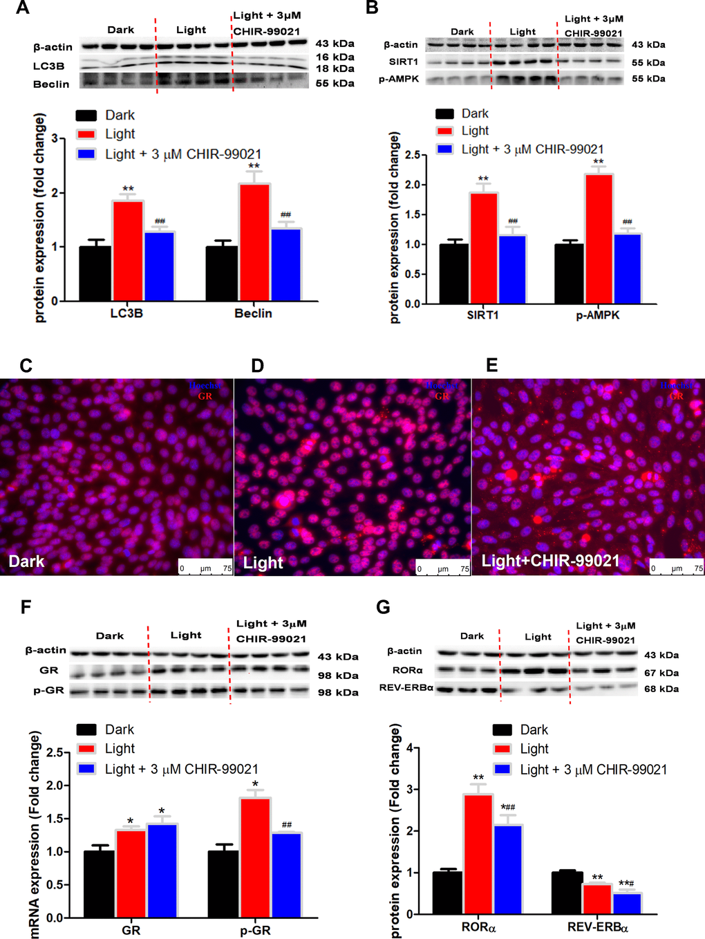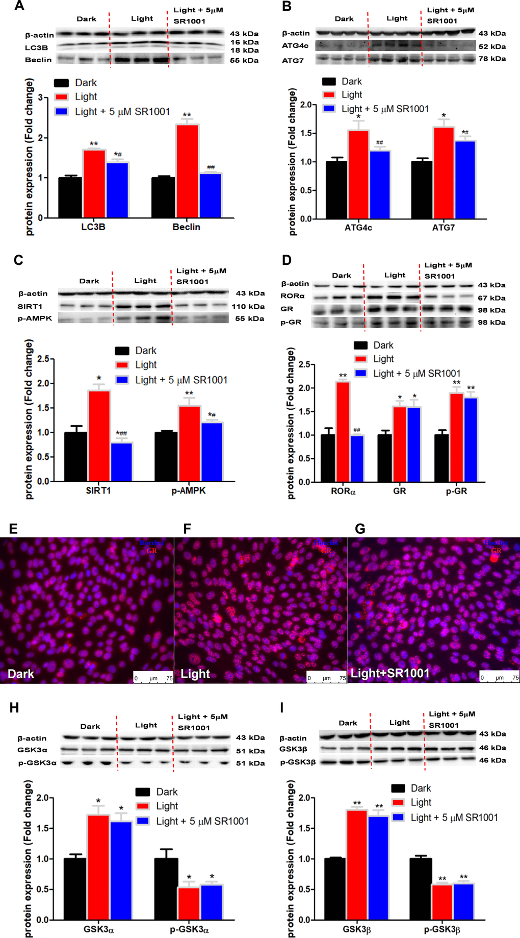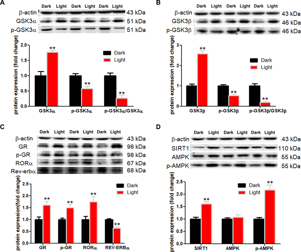 White LED light exposure significantly increased protein levels of GSK-3α and GSK-3β (p < 0.01), yet the serine-21 phosphorylated GSK-3α (Figure 3A) and serine-9 phosphorylated GSK-3β (Figure 3B) were significantly decreased (p < 0.01), indicating enhanced GSK-3 activity as phosphorylation at these particular serine residues inhibits the activity of GSK-3α and GSK-3β, respectively [30]. Concurrently, protein contents of GR and phospho-GR were also significant increased (p < 0.01). Moreover, RORα was significantly increased (p < 0.01), while REV-ERBα significantly decreased (p < 0.01) in light-exposed cells (Figure 3C), implicating possible disruption of clock genes and their circadian rhythms. Furthermore, SIRT1/AMPK pathway, which is known to regulate autophagy, is activated in response to white LED light exposure. The protein levels of SIRT1 and phospho-AMPK were significantly increased (p < 0.01) after LED light exposure (Figure 3D).