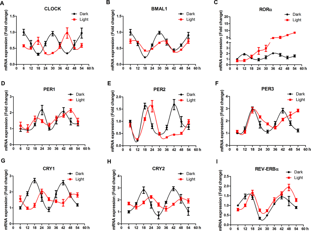 In order to elaborate the effect of white LED light on circadian rhythm of clock genes, we examined the mRNA expression profile of clock genes every 6 h for 48 h. In general, LED light exposure disrupted circadian rhythm of clock genes, in a gene-specific manner (Figure 4). Among 9 genes detected, clock (Figure 4A), bmal1 (Figure 4B), cry1 (Figure 4G) and cry2 (Figure 4H) genes displayed obvious time-phase shift and significantly suppressed (p < 0.01) oscillation amplitudes, while per1 (Figure 3D), per2 (Figure 4E) and per3 (Figure 4F) genes showed a delayed appearance of the 2nd peak, indicating reduced frequency of oscillation. Interestingly, rorα (Figure 4C) completely lost its circadian rhythm and kept increasing (p < 0.01) over the period of examination.