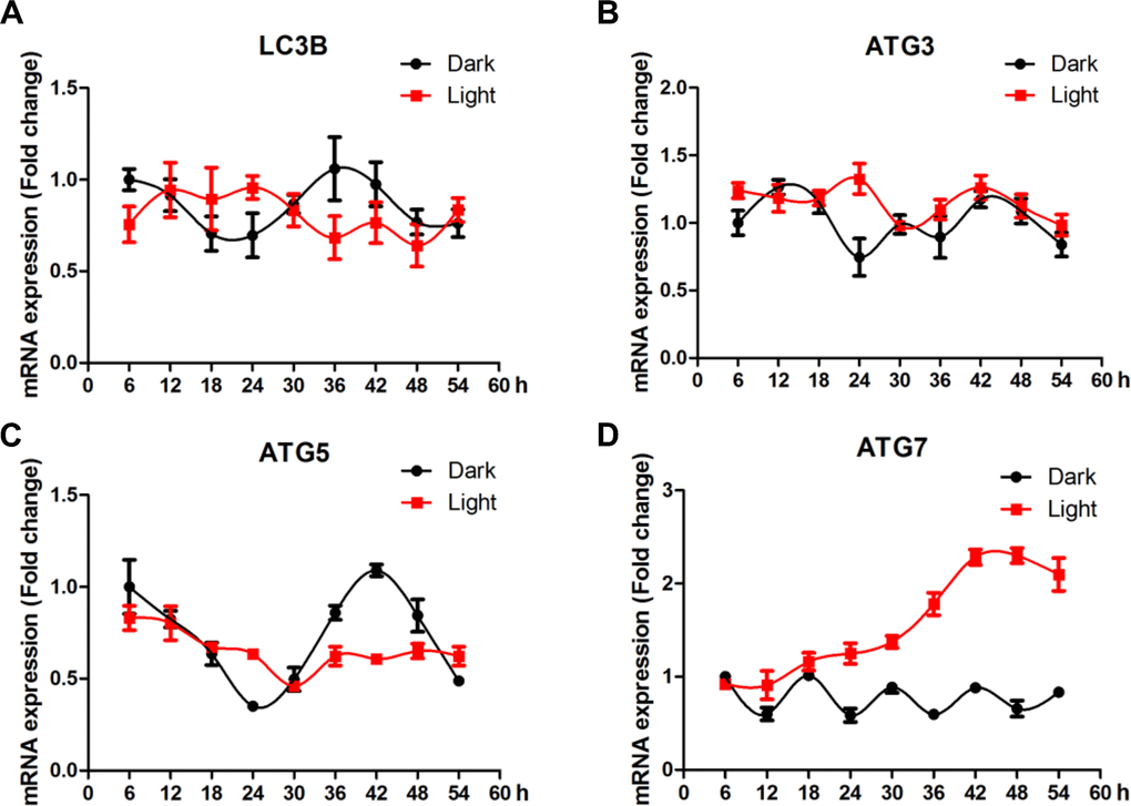 Compared to clock genes, autophagy-related genes showed less clear pattern of circadian rhythms (Figure 5). No significant effect of LED light exposure was observed for LC3B (Figure 5A), yet the fluctuation of ATG3 (Figure 5B) and ATG5 (Figure 5C) was significantly blunted (p < 0.05) in light-exposed cells. Interestingly, ATG7 (Figure 5D) was significantly up-regulated (p < 0.01), reaching a plateau at 42 h after light exposure.